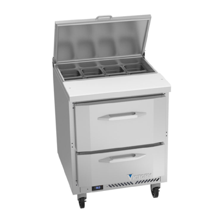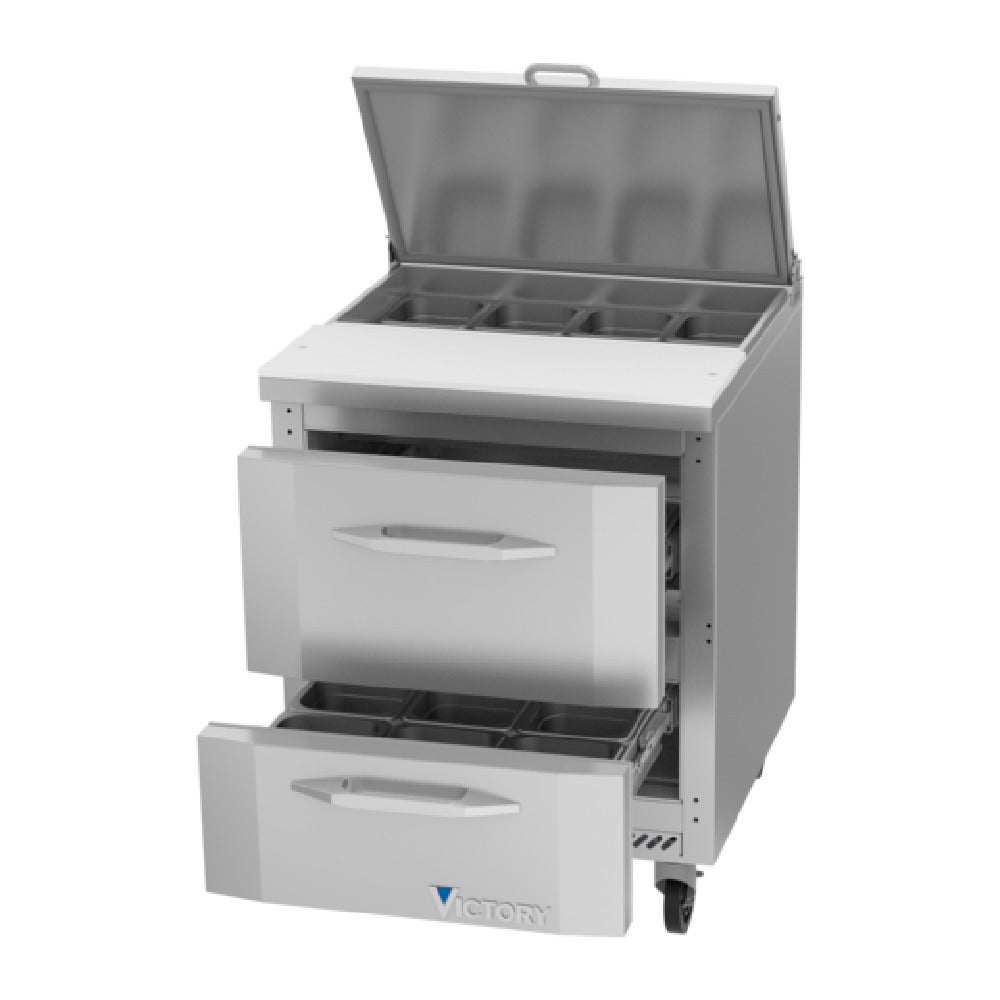 Victory VSPD27HC-08-2 UltraSpec™ Series Sandwich Prep Table Powered By V-Core™ is an advanced refrigeration solution designed for precise sandwich preparation needs. With a compact one-section design measuring 27 inches wide, it provides a substantial 6.77 cubic feet capacity, making it suitable for busy kitchens requiring efficient space utilization. It features two robust drawers; the upper drawer accommodates two 4-inch deep pans, and the lower drawer supports two 6-inch deep pans, although pans are not included. The stainless steel top includes slots for eight 1/6 size pans, complemented by a durable 10-inch cutting board made of white polyethylene plastic. The hinged, insulated flat lift-up lid ensures temperature retention, while the full electronic control system allows for precise operation. The exterior is crafted from stainless steel with an aluminum interior, paired with Santoprene gaskets backed by a 2-year warranty. The rear-mounted refrigeration system uses R290 Hydrocarbon refrigerant and a 1/10 HP motor, ensuring energy efficiency. Certified by cULus, UL EPH Classified, and UL-Sanitation, and proudly made in the USA, this prep table guarantees compliance with the highest standards, making it an invaluable asset for culinary professionals across various food service sectors.
