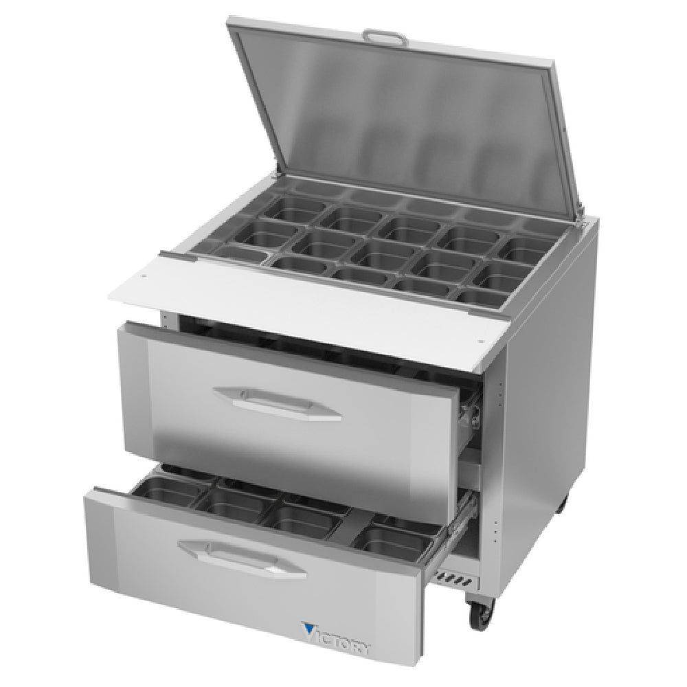 The Victory VSPD36HC-15B-2 UltraSpec™ Series Big Top Sandwich Prep Table Powered by V-Core™ is a highly efficient solution for food preparation needs, suitable across various segments of the foodservice industry. This one-section unit, with a width of 36 inches, offers a substantial 10.0 cubic feet capacity, facilitating optimal storage and preparation space. It includes two drawers, where the upper drawer can accommodate two 4-inch deep pans, and the lower drawer can hold two 6-inch deep pans, although the pans are not included. The prep table features a stainless steel top with an opening designed for fifteen 1/6 size pans and a 10-inch cutting board made from durable white polyethylene plastic. For enhanced organization, it includes locking divider bars and a hinged, insulated flat lift-up lid. This model is powered by a rear mount refrigeration system using R290 Hydrocarbon refrigerant, supported by a 1/6 HP motor. Its robust construction features a stainless steel front and sides, and an aluminum interior, ensuring durability and longevity. Additionally, it is equipped with Santoprene gaskets, backed by a two-year warranty. The unit is fully electronically controlled, cULus, UL EPH Classified, and UL-Sanitation certified, and proudly made in the USA.