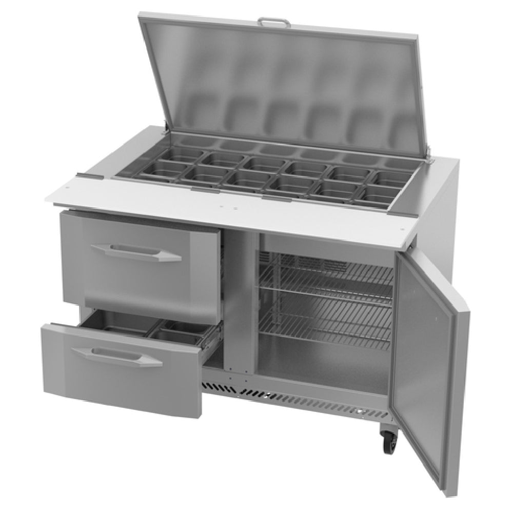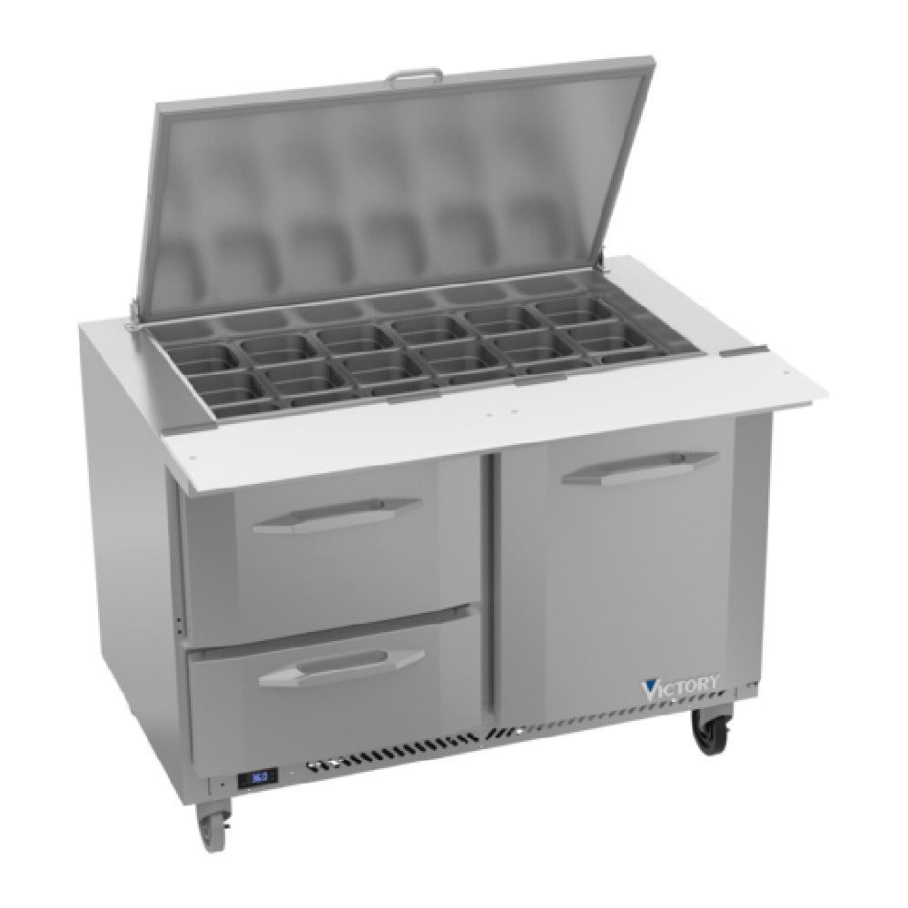 The Victory VSPD48HC-18B-2 UltraSpec™ Series Big Top Sandwich Prep Table Powered By V-Core™ is a versatile and high-capacity solution for commercial kitchens, particularly those specializing in sandwich preparation. It measures 48 inches wide and provides a generous 13.0 cubic feet capacity, making it an excellent choice for busy food service environments. This two-section unit features a self-contained refrigeration system powered by V-Core™, utilizing eco-friendly R290 Hydrocarbon refrigerant. It includes one self-closing door and two epoxy-coated shelves, alongside two drawers designed to accommodate pans of varying depths—4 inches in the upper drawer and 6 inches in the lower drawer (pans not included). The stainless steel top is designed with openings for 18 one-sixth size pans and features a 10-inch cutting board made from durable white polyethylene plastic. Additionally, the unit incorporates locking divider bars and a hinged, insulated flat lift-up lid for secure storage. The full electronic control system ensures precise temperature management, while the Santoprene gaskets come with a two-year warranty, enhancing durability and performance. Built with a robust stainless steel exterior and aluminum interior, the Victory VSPD48HC-18B-2 is cULus, UL EPH Classified, UL-Sanitation certified, and proudly made in the USA.