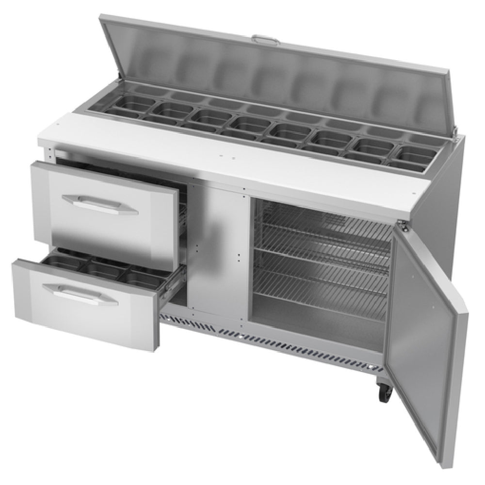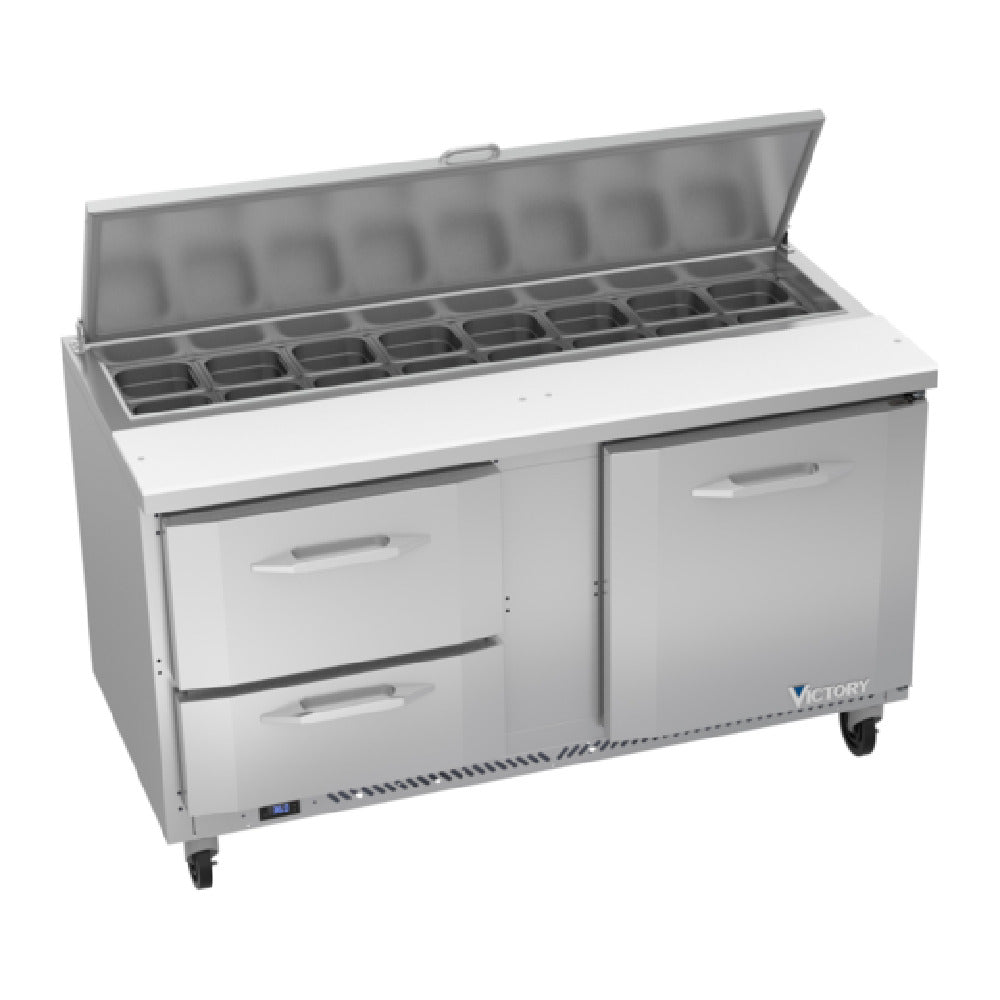 The Victory VSPD60HC-16-2 UltraSpec™ Series Sandwich Prep Table Powered By V-Core™ is a cutting-edge solution for commercial kitchen environments, designed with a focus on efficiency and versatility. Measuring 60 inches in width, this two-section, self-contained unit boasts a 16.0 cubic feet capacity, making it an ideal choice for high-volume food preparation. It features one self-closing door and two epoxy-coated shelves, alongside two drawers. The upper drawer can accommodate two 4-inch deep pans, while the lower drawer is designed for two 6-inch deep pans, though pans are not included. A stainless steel top includes openings for sixteen 1/6 size pans, complemented by a 10-inch cutting board crafted from durable white polyethylene plastic. The hinged, insulated flat lift-up lid and locking divider bars enhance functionality and food safety. Engineered with a rear-mounted refrigeration system, the table uses R290 Hydrocarbon refrigerant and operates with a 1/3 HP motor, ensuring reliable cooling performance. Constructed with a stainless steel door, front, and sides, and an aluminum interior, it is built for durability. Additional features include full electronic control and Santoprene gaskets with a two-year warranty. Certified by cULus, UL EPH, and UL-Sanitation, this product is proudly made in the USA.