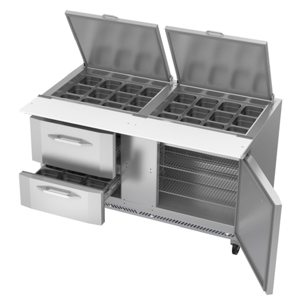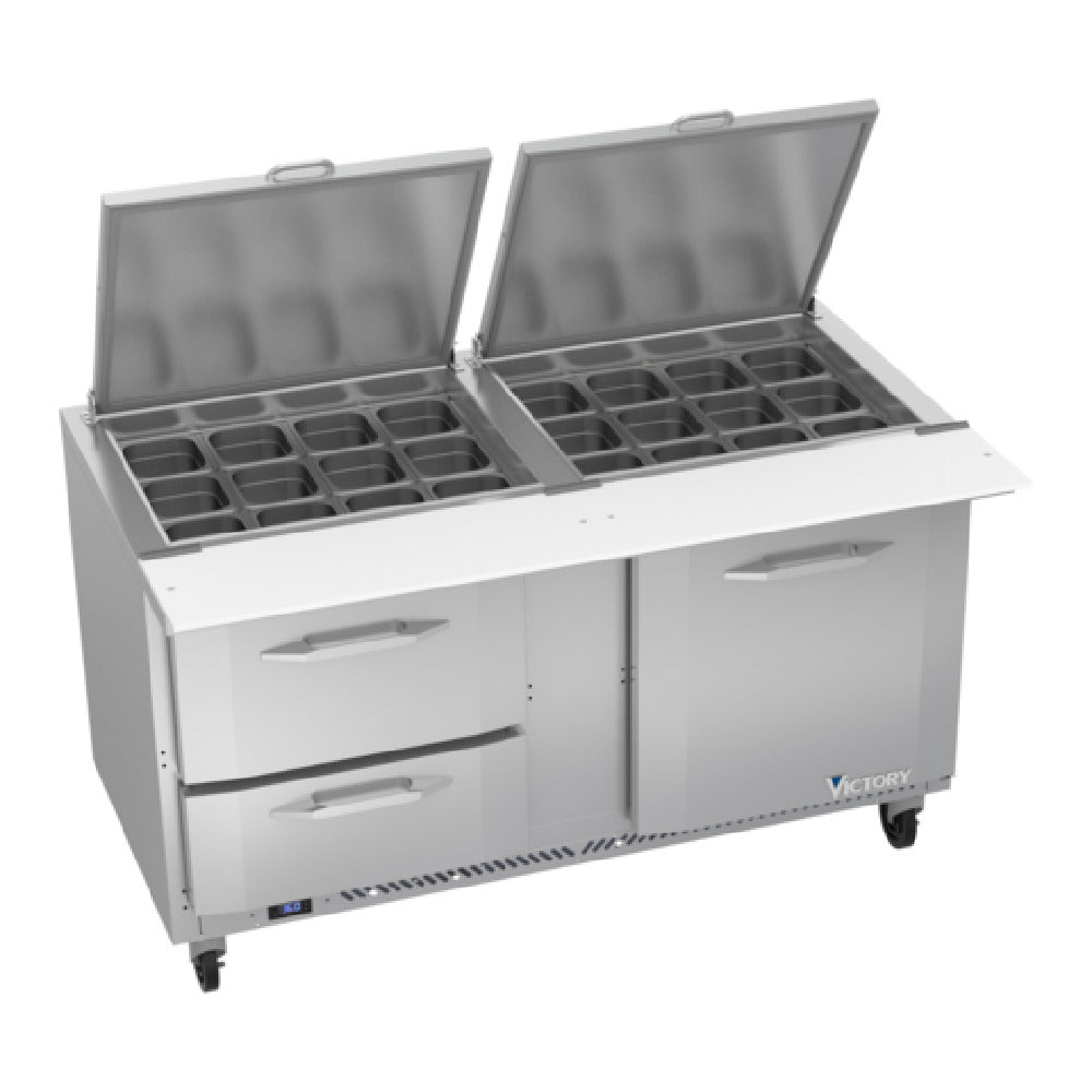 The Victory VSPD60HC-24B-2 UltraSpec™ Series Big Top Sandwich Prep Table Powered By V-Core™ is a versatile and efficient solution for food service establishments. This two-section unit, with dimensions of 60 inches in width, offers a self-contained refrigeration system with a 17.1 cubic feet capacity. It features a stainless steel top designed to accommodate 24 1/6 size pans, enhancing its usability in sandwich and salad preparation. The table includes one self-closing door and two epoxy-coated shelves, alongside two drawers capable of housing two 4-inch deep pans in the upper drawer and two 6-inch deep pans in the lower drawer, although pans are not included. A 10-inch cutting board made from white polyethylene plastic provides a durable work surface. The hinged, insulated flat lift-up lid ensures optimal temperature control, supported by full electronic controls. The durable construction is evident in its stainless steel exterior and aluminum interior, coupled with Santoprene gaskets that come with a two-year warranty. The rear-mounted refrigeration system utilizes R290 Hydrocarbon refrigerant, powered by a 1/3 HP compressor. This unit is cULus, UL EPH Classified, and UL-Sanitation certified, and is proudly made in the USA, making it a reliable and compliant choice for professional kitchens.