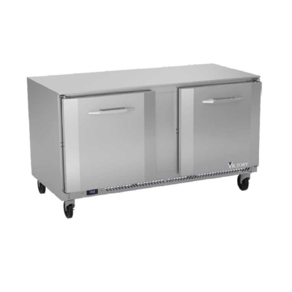 The Victory VUF60HC Undercounter Freezer Powered by V-Core™ Two-section is a high-performance refrigeration solution, specifically engineered for the demanding environments of commercial kitchens. This undercounter freezer boasts a 60" width and a substantial 14.39 cubic feet capacity, making it ideal for efficiently storing a variety of frozen goods. It features rear-mounted self-contained refrigeration, ensuring optimal temperature control and energy efficiency. The unit is equipped with two self-closing doors and four epoxy-coated wire shelves, providing durable storage and easy organization. Its exterior is constructed with a 1/2" thick stainless steel top and stainless steel doors, front, and sides, ensuring longevity and resistance to wear and tear. Inside, the aluminum interior is outfitted with Santoprene gaskets, which come with a 2-year warranty, further enhancing its durability and reliability. This model utilizes R290 Hydrocarbon refrigerant and a 1/2 HP motor, highlighting its commitment to environmentally conscious and powerful performance. Certified by UL-Sanitation, cULus, and UL EPH Classified, and proudly made in the USA, the Victory VUF60HC is a sophisticated choice for various industry segments, offering technical excellence and robust construction to meet diverse refrigeration needs.