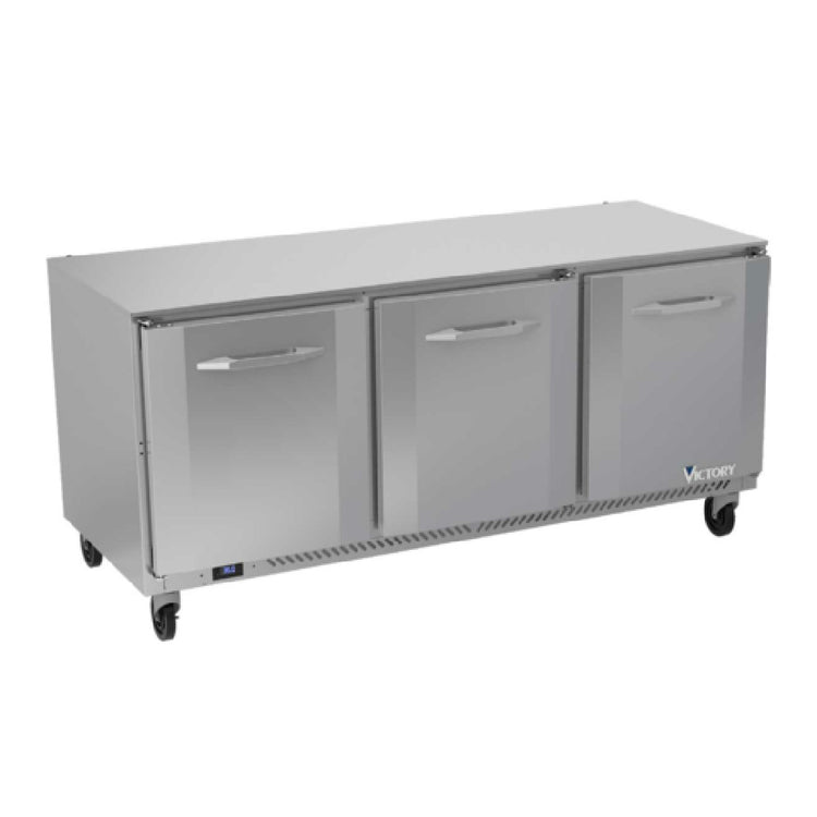 The Victory VUR72HC Undercounter Refrigerator Powered By V-Core™ Three-section is a high-performance refrigeration unit tailored for commercial kitchens demanding efficiency and reliability. With a width of 72 inches and a generous capacity of 17.88 cubic feet, this refrigerator is engineered to accommodate substantial storage needs within a compact undercounter space. Its rear-mounted self-contained refrigeration system ensures optimal cooling performance, utilizing R290 Hydrocarbon refrigerant for an eco-friendly operation. The unit is equipped with three self-closing doors, each featuring durable stainless steel construction on the front and sides, while the interior is crafted from aluminum for lightweight durability. Inside, six epoxy-coated wire shelves provide flexible storage options. The stainless steel top, measuring 1/2 inch in thickness, offers additional workspace utility. Control is streamlined with full electronic functionality, enhancing user convenience. The use of Santoprene gaskets, backed by a two-year warranty, underscores the product's commitment to quality and longevity. Powered by a 1/5 horsepower compressor, the Victory VUR72HC is UL-Sanitation, cULus, and UL EPH Classified, ensuring compliance with rigorous safety standards. Proudly made in the USA, this refrigerator is a testament to engineering excellence, catering to diverse market segments in the food service industry.