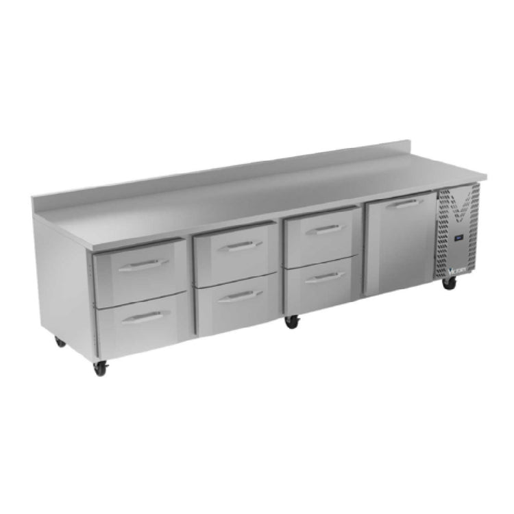 Victory VWRD119HC-6 Worktop Refrigerated Counter Powered By V-Core™ Four-section is an advanced refrigeration solution designed for commercial kitchens seeking efficiency and reliability. This worktop counter spans 118-7/8 inches in width and offers a substantial 40.12 cubic feet capacity, making it suitable for high-volume operations. The unit features a side-mounted, self-contained refrigeration system powered by V-Core™ technology, utilizing R290 Hydrocarbon refrigerant for environmentally conscious performance. It includes a self-closing door and two epoxy-coated wire shelves, providing versatile storage options. Additionally, six drawers with telescoping slides and a locking mechanism can accommodate 4 or 6-inch deep pans, though these pans are not included. The full electronic control system ensures precise temperature management, while the stainless steel worktop, door, front, and sides enhance durability. Its aluminum interior and 4-inch high foamed-in-place backsplash contribute to its robust construction. Engineered with Santoprene gaskets, this counter offers a two-year warranty for added peace of mind. Certified by UL-Sanitation, cULus, and UL EPH Classified, and proudly made in the USA, the Victory VWRD119HC-6 is an exceptional choice for diverse market segments within the foodservice industry, delivering unmatched value through its meticulous design and superior build quality.