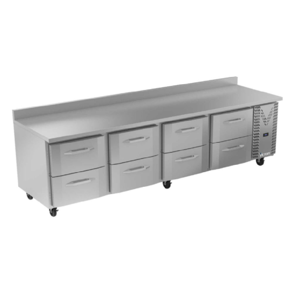 Victory VWRD119HC-8 Worktop Refrigerated Counter Powered By V-Core™ Four-section is a versatile refrigeration unit, ideal for commercial kitchens requiring substantial storage and workspace. Measuring 118-7/8" wide, this counter offers a generous 40.12 cubic feet capacity across four sections. It features eight drawers with telescoping slides and a locking mechanism, accommodating pans up to 6" deep (pans not included). The side-mounted self-contained refrigeration system utilizes R290 Hydrocarbon refrigerant and a 1/3 HP compressor to deliver efficient cooling. Constructed with a durable stainless steel worktop and sides, and an aluminum interior, it ensures longevity and easy maintenance. The 4" high foamed-in-place backsplash prevents spills and maintains a clean work environment. Full electronic controls allow precise temperature management, enhancing food safety and quality. Santoprene gaskets, backed by a 2-year warranty, ensure a tight seal, maintaining consistent internal temperatures. Certified by UL-Sanitation, cULus, and UL EPH, this made-in-USA unit meets rigorous standards for safety and performance, making it a reliable choice for food service operations seeking a durable, efficient, and environmentally friendly refrigeration solution.