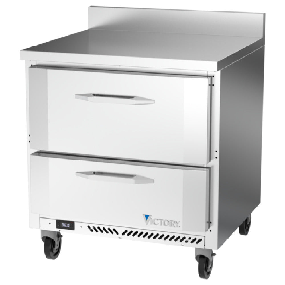 The Victory VWRD32HC-2 Worktop Refrigerated Counter Powered By V-Core™ One-section is a versatile refrigeration solution designed to meet the diverse needs of commercial kitchens. This unit features a compact 32-inch width with a rear-mounted, self-contained refrigeration system, ensuring efficient use of space and ease of installation. It offers a capacity of 7.22 cubic feet, making it ideal for small to medium-sized food storage requirements. The counter includes two drawers equipped with telescoping slides and a locking mechanism, accommodating pans up to 4" or 6" deep, though these pans are not included. Its stainless steel worktop and front and sides, coupled with an aluminum interior, provide durability and a sleek appearance, while the 4-inch high foamed-in-place backsplash ensures cleanliness and convenience. With full electronic control and Santoprene gaskets backed by a two-year warranty, the unit promises easy operation and maintenance. Utilizing R290 Hydrocarbon refrigerant and powered by a 1/6 HP motor, it underscores energy efficiency and environmental responsibility. Certified by UL-Sanitation, cULus, and UL EPH Classified, and proudly MADE IN USA, this refrigerated counter is a reliable choice for enhancing the operational efficiency of any food service establishment.