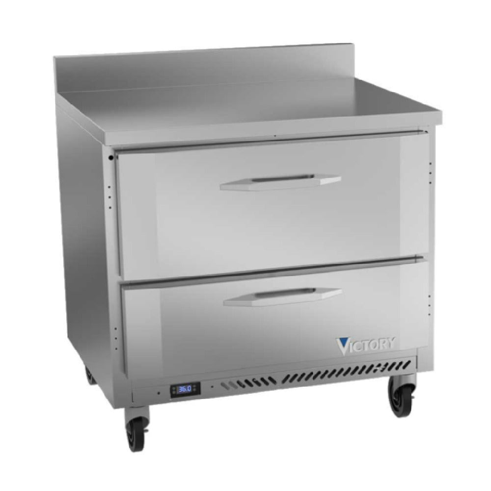 The Victory VWRD36HC-2 Worktop Refrigerated Counter Powered By V-Core™ is a versatile one-section unit designed to enhance efficiency in commercial kitchens. Measuring 36 inches in width, it features a rear-mounted, self-contained refrigeration system with an 8.5 cubic feet capacity, making it suitable for various storage needs. This unit includes two drawers equipped with telescoping slides and a locking mechanism, capable of accommodating 4-inch or 6-inch deep pans, although pans are not included. The full electronic control ensures precise temperature management, while the stainless steel worktop and sides provide durability and aesthetic appeal. Inside, an aluminum interior complements the robust construction, featuring a 4-inch high foamed-in-place backsplash for added convenience. The use of R290 Hydrocarbon refrigerant highlights the unit's eco-friendly design, powered by a 1/6 HP motor. Ensuring quality and safety, this refrigerated counter is UL-Sanitation, cULus, and UL EPH Classified, and proudly made in the USA. With Santoprene gaskets backed by a 2-year warranty, this refrigerated counter is engineered for longevity and reliability, making it an ideal choice for various segment markets within the food service industry seeking efficiency and sustainability.