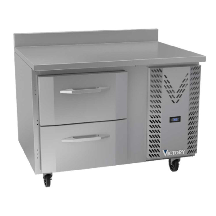 The Victory VWRD46HC-2 Worktop Refrigerated Counter Powered by V-Core™- One-section exemplifies advanced refrigeration engineering, tailored for commercial culinary environments. With a compact width of 46-1/8 inches, this unit is perfectly designed for space-conscious kitchens requiring efficient, reliable cold storage solutions. It boasts a substantial 10.8 cubic feet capacity, with two robust drawers on telescoping slides, secured with a locking mechanism. These drawers are versatile, accommodating 4 or 6-inch deep pans, though pans are not included. The refrigeration system is side mounted and self-contained, utilizing R290 Hydrocarbon refrigerant, noted for its environmentally friendly properties. The unit is powered by a 1/5 HP engine, ensuring efficient cooling performance. The exterior is crafted from durable stainless steel, with an aluminum interior and features a 4-inch high foamed-in-place backsplash for added practicality. Additionally, Santoprene gaskets come with a two-year warranty, underscoring the product's quality assurance. Control is fully electronic, enhancing ease of use and precision in temperature management. Certified by UL-Sanitation, cULus, and UL EPH Classified, and proudly made in the USA, this refrigerated counter is a testament to Victory Refrigeration's commitment to quality and innovation, making it an invaluable asset in diverse food service segments.