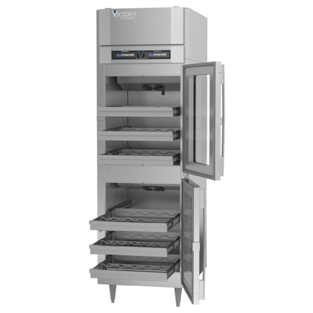The Victory WCDT-1D-S1-HC Dual Temperature Refrigerated Wine Cooler, Powered By V-Core™, is an expertly crafted solution for wine storage, catering to industry professionals with its top mount self-contained refrigeration system. This cooler features a one-section design, distinguished by its two separate 8.99 cu. ft. compartments that can collectively accommodate up to 60 wine bottles. Each compartment is accessible via half-height locking hinged glass doors, ensuring both security and visibility. Inside, each door is equipped with three adjustable shelves, allowing for customizable storage configurations. The cooler boasts an insulated partition, enhancing its dual temperature functionality. A digital temperature display and controls facilitate precise climate management, while LED lighting provides clear visibility of contents. Employing expansion valve technology and adaptive defrost, along with top-mounted air-cooled refrigeration, this unit delivers superior efficiency and performance. Constructed with durable stainless steel, the cooler is powered by two 1/3 HP compressors. It is cULus, UL EPH Classified, and UL-Sanitation certified, guaranteeing compliance with rigorous safety standards. Proudly made in the USA, the Victory WCDT-1D-S1-HC is an exceptional choice for wine connoisseurs seeking high-quality refrigerated storage solutions that seamlessly combine advanced technology and robust construction.
