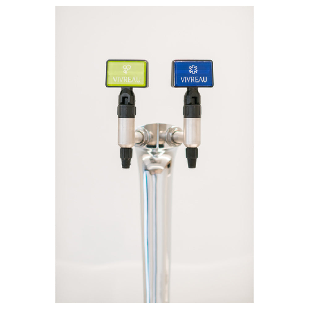 The Vivreau V3-202 - 1045954 Vivreau High Volume Water Bottling System Dual Tap Undercounter Cabinet is a state-of-the-art solution designed for high-demand environments requiring efficient water dispensing. This system features a dual tap setup housed within a sleek undercounter cabinet, ensuring both functionality and space efficiency. The self-contained ice bank refrigeration system ensures optimal cooling performance, delivering both chilled still and sparkling water on demand. It utilizes a micro-filtration process, guaranteeing superior water purity and taste. The twin tap design includes removable nozzles for easy maintenance and a stainless steel drip tray to minimize spillage and maintain cleanliness. This unit accommodates a 20 lb CO2 cylinder, though the cylinder itself is not included. For ease of installation and mobility, it comes with front feet and rear rollers. Operating at 120 volts, 60 hertz, single-phase with a current draw of 11.0 amps, it is equipped with a NEMA 5-15P plug. The Vivreau V3-202 is ETL and NSF certified, confirming its compliance with safety and sanitation standards, and is intended for indoor use only. This high-performance water bottling system is ideal for businesses and institutions prioritizing quality and efficiency in hydration solutions.