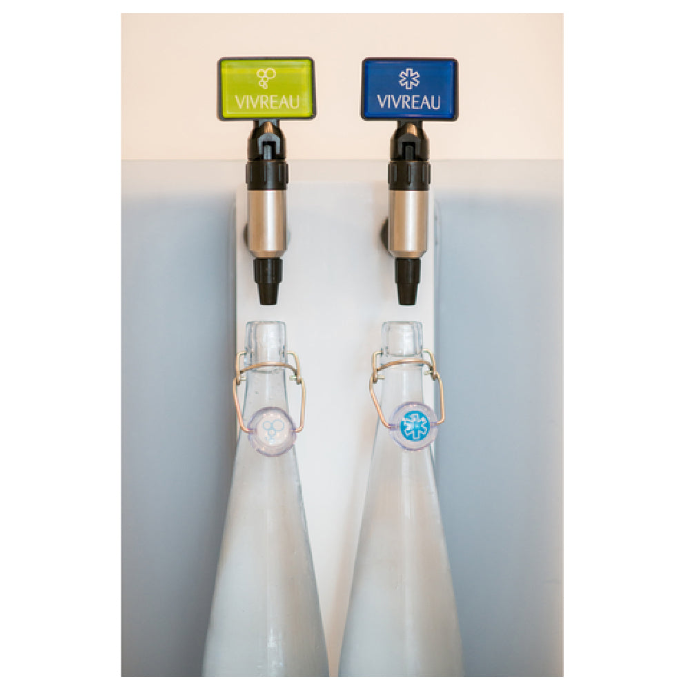 The Vivreau V3-204 (1025648) Vivreau Water Bottling System Mini Bottler Dual Tap is a sophisticated countertop unit designed for efficient water dispensing. Equipped with a self-contained ice-bank refrigeration system, this mini bottler provides both chilled still and sparkling water, ensuring a refreshing experience. The unit incorporates micro-filtration technology, delivering high-quality purified water suitable for various settings. It comes with a dual tap mechanism, allowing users to conveniently select between still and sparkling options. The system includes a filter with a filter head, enhancing the water's purity. For carbonation, it supports a 20 lb. CO2 cylinder, provided by the customer, and features an integrated CO2 regulator to maintain optimal pressure levels. Constructed with a durable stainless steel drip tray and removable nozzles, it is easy to clean and maintain. Operating at 120v/60/1-ph, the system requires an 8.0 amp connection and is compatible with a NEMA 5-15P outlet. Certified by ETL and NSF for indoor use, the Vivreau V3-204 is a reliable choice for hotels, restaurants, and corporate settings, offering consistent performance with its robust design and advanced features.