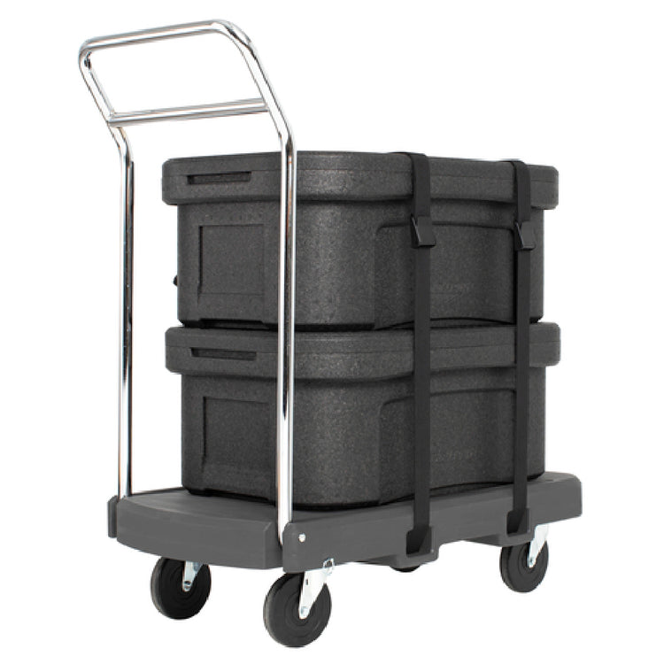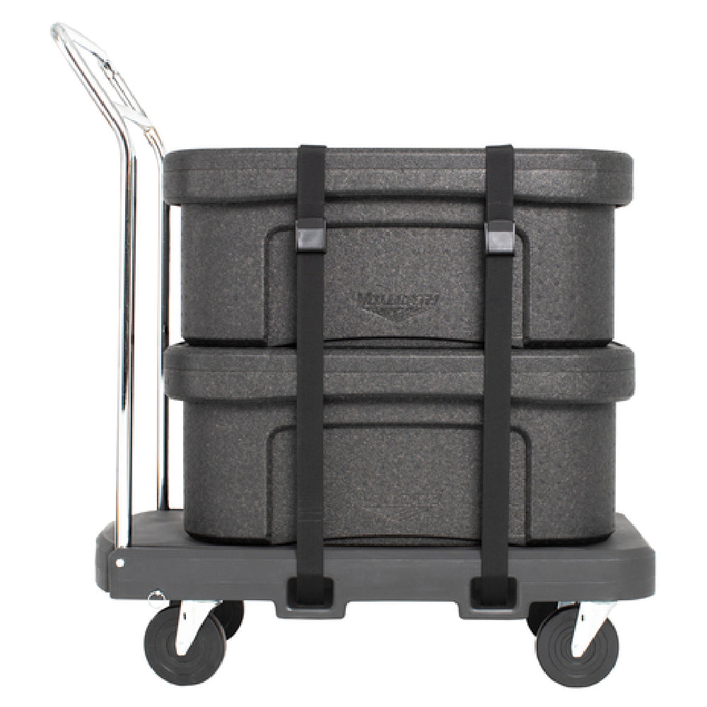 The Vollrath 1694 Utility Dolly is a robust transportation solution designed for heavy-duty tasks, with its flatbed and recessed top surface enhancing load stability and security. This utility dolly is equipped with 1-1/2 inch black heavyweight polypropylene webbed straps, ensuring that items remain securely fastened during transit. It features a storage pocket which adds convenience for users needing quick access to essential tools or documents. With a capacity to transport up to 350 pounds, this dolly is constructed from heavy-duty plastic, ensuring durability and long-lasting performance in demanding environments. The mobility of the Vollrath 1694 is facilitated by its set of four 5-inch casters - two fixed wheels in the front for steady movement and two swivel wheels with brakes at the back for enhanced control and safety. The dark gray finish adds a professional appearance, and the fact that it is made in the USA speaks to its quality and adherence to rigorous manufacturing standards. This utility dolly is an ideal choice for industries requiring reliable transport solutions, such as warehouses, distribution centers, and industrial settings, offering a practical and efficient method for moving heavy loads with ease.