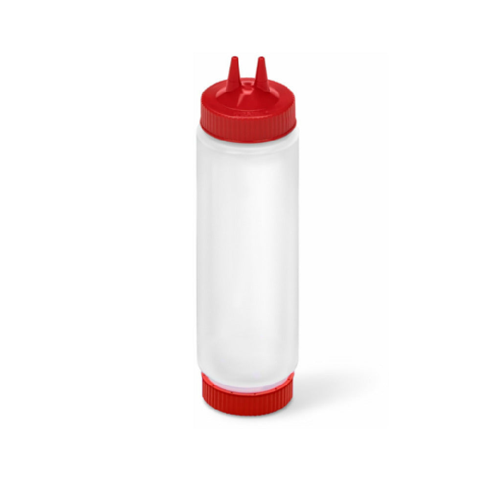 The Vollrath 23242-130202 Traex-FIFO Twin Tip-Squeeze Bottle Dispenser, with a capacity of 24 oz., is a high-quality dispensing solution tailored for diverse food service applications. Engineered with a clear bottle design paired with a distinctive red tip and base cap, this dispenser ensures easy identification and aesthetic appeal. Its double tip feature provides versatility in dispensing, accommodating various culinary needs by allowing two different flow rates or the simultaneous use of two different condiments. The FIFO (First In, First Out) system of this squeeze bottle promotes efficient inventory management by ensuring that the oldest product is used first, thereby minimizing waste and maintaining freshness. This product's transparent body allows users to easily monitor the contents, aiding in timely refills and maintaining service efficiency. Suitable for restaurants, catering services, and fast-food chains, the Vollrath Traex-FIFO Twin Tip-Squeeze Bottle Dispenser offers a practical and efficient solution for dispensing condiments, dressings, and sauces. Its user-friendly design and reliable construction make it an essential tool for professional kitchens, facilitating smooth operations and enhancing customer experience by ensuring quick and precise condiment dispensing.