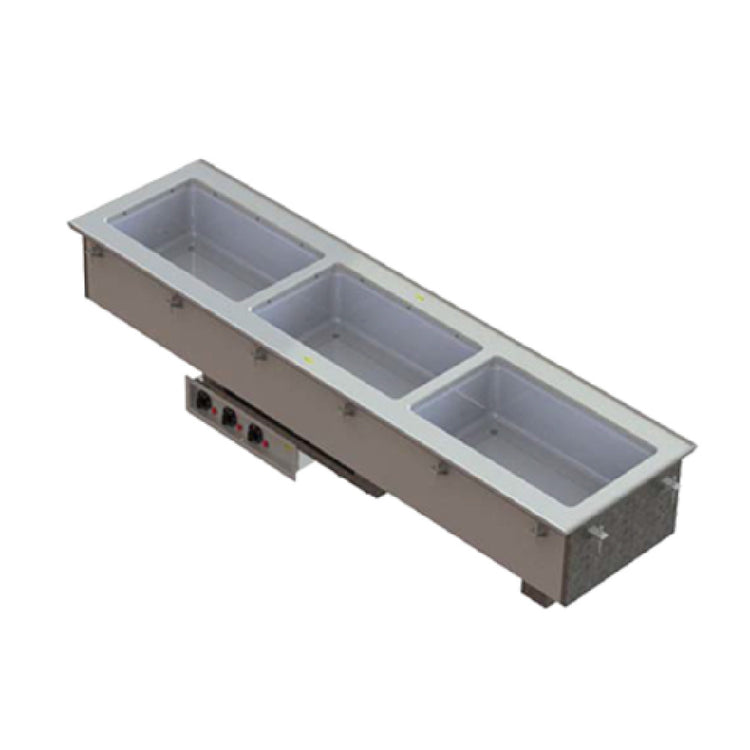 The Vollrath 36649 Short Sided Hot Well Drop-In (3) Pan is a high-performance unit tailored for efficient food service operations. This model features three pans with infinite controls, accommodating diverse culinary needs while offering precise temperature management. Operating between 208-240 volts and drawing 10.8-12.5 amps, it delivers 3000 watts of power, making it ideal for high-demand environments. The unit is equipped with standard drains and a NEMA 6-20P plug, ensuring compatibility and ease of use. Its design turns full-size pans sideways, facilitating a narrower presentation and easy reach. Constructed from 18/8 stainless steel, it boasts exceptional durability and resistance to corrosion, while the thick polyurethane foam insulation ensures energy efficiency and temperature retention. The full perimeter drip edge and included drain plug enhance functionality by preventing spills and simplifying cleaning. Measuring 66-7/8" x 18" with a 7/8" corner radius, the cutout dimensions are 66-1/16" x 17-1/4". The well size is 20" x 12" with an 8" deep well, offering ample space for extensive culinary creations. Certified by UL, CUL, and NSF, the unit meets rigorous industry standards for safety and sanitation. Proudly made in the USA, the Vollrath 36649 is a reliable choice for diverse market segments in the food service industry.
