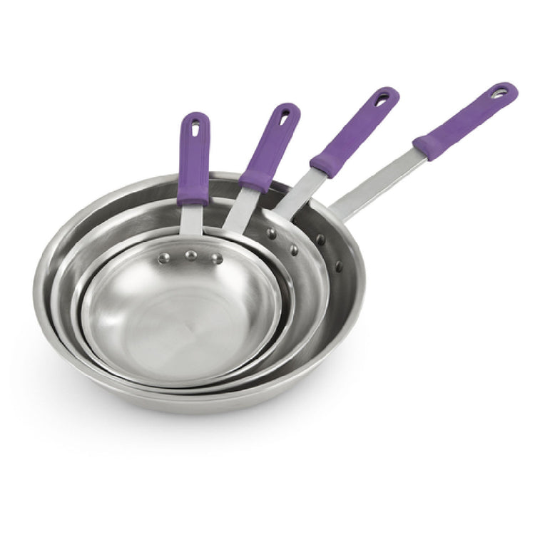 The Vollrath 401080 Wear-Ever® Aluminum Fry Pan 10" (25.4 cm) with Natural Finish is a versatile kitchen essential designed for both stovetop and oven use. This fry pan features a removable purple silicone insulated handle, which is rated to withstand temperatures up to 450°F, ensuring safety and comfort during cooking. The innovative EverTite™ Riveting System provides exceptional durability and strength, making it ideal for professional kitchens and home chefs alike. With a bottom diameter of 7-5/8" (20 cm) and an inside height of 2" (5.1 cm), this pan offers ample space for a variety of cooking tasks. Constructed from 8-gauge aluminum, it ensures even heat distribution for optimal cooking performance. This pan is NSF certified, guaranteeing it meets high standards of public health and safety, and is proudly made in the USA. The Vollrath 401080 is an excellent choice for culinary professionals seeking a reliable and efficient fry pan that delivers consistent results. Its combination of high-quality materials and thoughtful design makes it a standout option in the foodservice industry, catering to diverse market segments looking for both functionality and durability in their kitchen equipment.