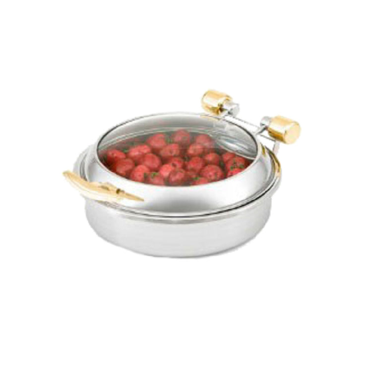 The Vollrath 46124 Intrigue® Glass Top Induction Chafer Large Round is a versatile and elegantly designed piece, ideal for both high-end catering events and everyday buffet settings. Boasting a large, round 6-quart (5.8L) capacity, it is crafted from a mirror finish 18-8 stainless steel with brass trim, ensuring durability and an upscale appearance. The chafer features a removable glass lid with brass trim, providing an elegant presentation while allowing easy access to food. Its baffle hinge accommodates the cover in closed, 45°, or 90° positions, offering flexibility in service and presentation. The low-profile stainless water pan is constructed with a mirror finish 18-0 stainless steel, enhancing both functionality and aesthetics. Designed with a reinforced bracket and rubber table feet, the chafer ensures stability and minimizes movement during service. With dimensions of 15-1/2" x 3-5/32", this imported chafer is engineered to perform seamlessly with induction heat sources, making it an excellent choice for professional chefs and caterers seeking efficiency and style. The Vollrath 46124 Intrigue® Chafer stands out in the industry for its combination of innovative design, high-quality materials, and practical features, meeting the diverse needs of food service professionals.