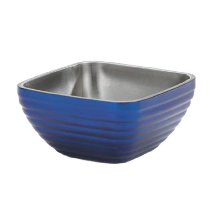 The Vollrath 4763225 Serving Bowl Square Double Wall Insulated is expertly crafted to meet the precise needs of the hospitality and catering industries. With a capacity of 1.8 quarts, this serving bowl is designed for efficiency and style. Its dimensions of 7-1/4 inches in width and depth, and 3-7/16 inches in height, make it a compact yet functional choice for serving. The bowl's striking metallic cobalt blue exterior finish adds a touch of elegance, while the satin stainless steel interior finish ensures durability and a professional appearance. This serving bowl features a double wall insulation, which is pivotal for maintaining the temperature of its contents, making it an essential tool for food service settings where presentation and functionality are paramount. Although it is not recommended for use with ice, the bowl's design is optimized for other serving needs. Hand washing is advised to preserve its finish and integrity. Imported and NSF certified, the Vollrath 4763225 is a testament to quality and compliance with safety standards, making it a reliable choice for professional culinary environments.