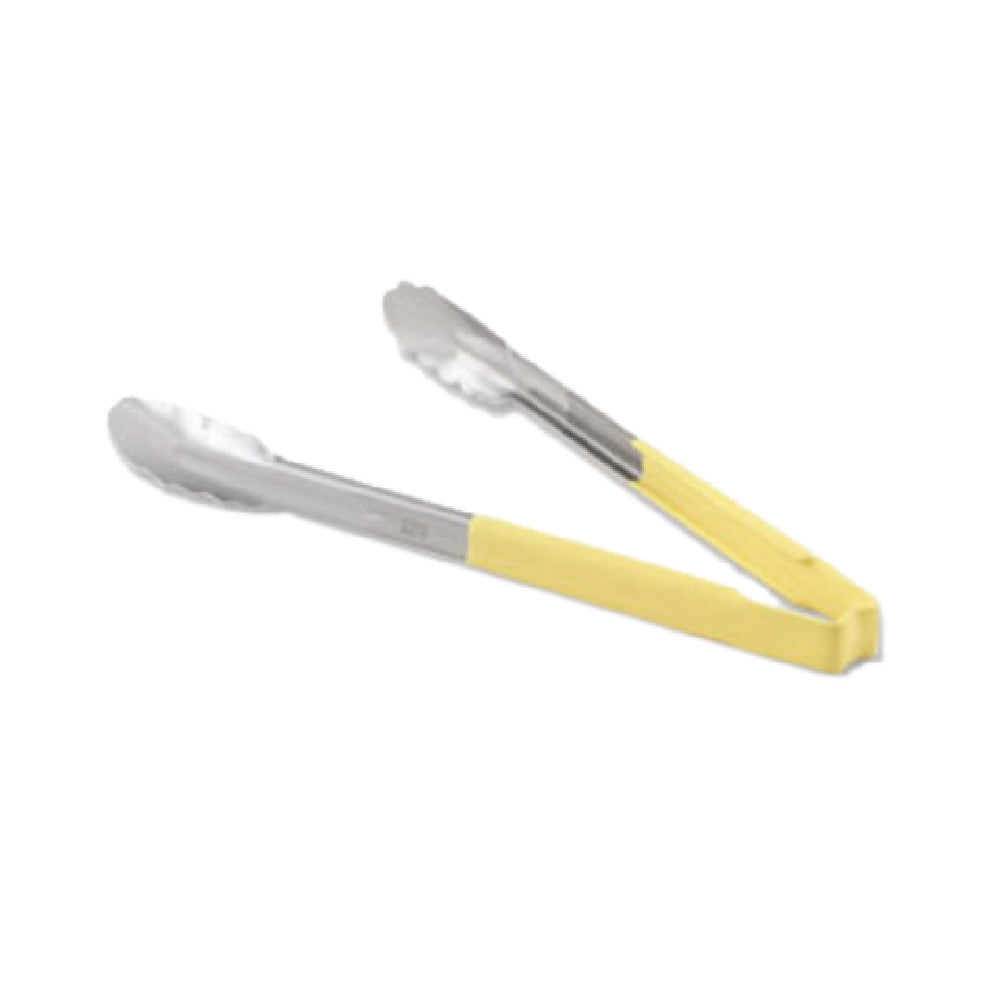The Vollrath 4780950 Utility Tongs stand out with their one-piece design and a length of 9-1/2 inches (24.1 cm), making them a reliable tool for various culinary tasks across different segment markets. The tongs feature scalloped teeth, ensuring a secure grip on food items. A notable aspect of this product is its springless design, which enhances durability and ease of use. Equipped with a yellow ergonomic antimicrobial Kool-Touch® handle, these tongs are heat resistant to 225°F (107.2°C) and remain fully functional up to 350°F (176.6°C). This feature makes them ideal for handling hot foods safely. Constructed from stainless steel, they ensure long-lasting performance and are dishwasher safe, simplifying maintenance and ensuring hygiene. As part of the NSF-certified Jacob's Pride® Collection, these utility tongs are made in the USA and come with a limited lifetime warranty, underscoring their quality and reliability. These tongs are particularly valuable in professional kitchens, food service operations, and catering environments where safety, hygiene, and durability are paramount.