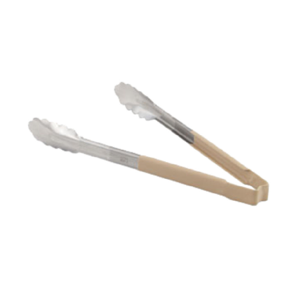 The Vollrath 4780960 Utility Tongs One-piece 9-1/2" (24.1 cm) are a versatile kitchen tool designed for both professional chefs and home cooking enthusiasts. These tongs feature a robust one-piece stainless steel construction, ensuring durability and longevity in various culinary environments. The scalloped teeth provide a firm grip on food items, enhancing precision during cooking or serving. Notably, these utility tongs have a springless design, eliminating the need for maintenance and reducing the risk of mechanical failure. The ivory ergonomic Kool-Touch® handle is heat resistant up to 225°F (107.2°C) and remains fully functional up to 350°F (176.6°C), offering safety and comfort during high-heat cooking tasks. This antimicrobial handle also promotes hygiene, making it ideal for settings where food safety is paramount. Dishwasher safe for easy cleaning, these tongs meet NSF standards, verifying their compliance with public health regulations. Part of the Jacob's Pride® Collection, the Vollrath 4780960 is proudly made in the USA and comes with a limited lifetime warranty, underscoring its quality and reliability. These tongs are a valuable tool for foodservice professionals needing dependable, hygienic, and durable kitchen utensils.