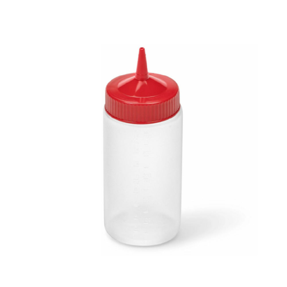 The Vollrath 4916-1302 Traex® Color-Mate™ Squeeze Bottle Dispenser - 16 oz. Wide Mouth is an essential tool for kitchens and food service establishments seeking efficiency and precision. This dispenser features a 16 oz. capacity and a wide mouth for easy filling and cleaning, accommodating a range of sauces and condiments. Crafted from durable polyethylene, the clear bottle allows for quick identification of contents, reducing downtime during busy service periods. It also includes a standard red cap, which adds a visual distinction and helps in organizing various condiments when multiple bottles are used. Packaged with 12 bottles per case, this product offers scalability for businesses of all sizes. The Vollrath 4916-1302 is particularly valuable for restaurants, catering services, and food preparation settings where consistent dispensing is crucial. Its polyethylene construction ensures longevity and resistance to the rigors of daily use, making it a reliable choice for high-volume operations. Designed with usability in mind, the Traex® Color-Mate™ Squeeze Bottle Dispenser balances practicality and functionality, catering to the dynamic needs of food service professionals. The combination of its technical specifications and thoughtful design elevates the efficiency and organization within any culinary environment.