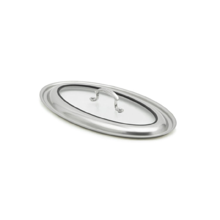 The Vollrath 49442C Miramar® Lid, sized at 16 inches by 9 inches by 2-1/2 inches, is an expertly crafted oval lid specifically designed to complement 16-inch oval au gratin pans. This lid is a blend of glass and stainless steel, providing both durability and a sleek, professional appearance. The robust construction ensures long-lasting performance, suitable for the demanding environments of commercial kitchens as well as upscale dining establishments. The riveted handles offer secure and comfortable handling, enhancing safety and efficiency during use. This thoughtful design makes the Vollrath 49442C Miramar® Lid a valuable asset in the professional culinary space, from restaurants to catering services, where maintaining quality and presentation is paramount. Its compatibility with au gratin pans adds to its versatility, making it an essential tool for chefs who specialize in oven-to-table presentations. The combination of materials used in this lid not only ensures durability but also ease of cleaning and maintenance, which is crucial in maintaining high standards of kitchen hygiene. The Vollrath 49442C Miramar® Lid stands out as a reliable and stylish addition to any culinary operation that requires precision and aesthetic appeal.