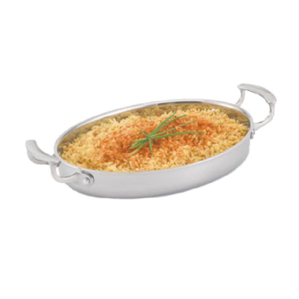 The Vollrath 49452 Miramar™ Display Cookware Oval Au Gratin is a versatile and high-quality cookware piece with a capacity of 5.1 quarts, measuring 12 inches in width, 8-1/2 inches in depth, and 4 inches in height. Engineered with a 3-ply construction, this cookware features an 18-8 stainless steel interior, which ensures durability and resistance to corrosion, paired with an 18-0 stainless steel exterior. The bottom and side walls incorporate a 3004 aluminum core, enhancing heat distribution and retention for consistent cooking results. The satin finish on both the interior and exterior surfaces provides an elegant appearance, while the mirror-finished welded handles offer not only superior strength but also ease of handling. Designed for use across various heat sources including gas, electric, and induction ranges, this cookware is a versatile addition to any kitchen. As part of the NSF-certified Jacob's Pride® Collection, it meets rigorous public health and safety standards. Imported and backed by a limited lifetime warranty, the Vollrath Miramar™ Oval Au Gratin combines functionality with aesthetic appeal, making it a valuable asset for professional chefs, caterers, and home cooking enthusiasts seeking reliable and stylish cookware solutions.
