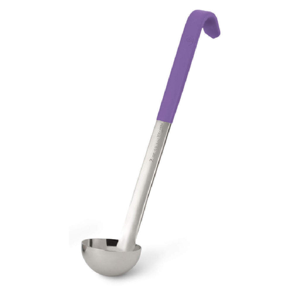 The Vollrath 4980280 Ladle is a robust kitchen tool, equipped with all-natural antimicrobial protection, ensuring hygiene and safety in food service environments. This one-piece ladle is crafted from heavy-duty 18/8 stainless steel, providing durability and resistance to corrosion. The ladle features an 11 gauge, 9-7/8-inch grooved hooked purple Kool-Touch™ handle with a satin finish, designed for comfort and a secure grip, even in high-temperature settings. The 18 gauge bowl has a diameter of 2-3/8 inches and a mirror finish that adds an aesthetic touch while facilitating easy cleaning. It has a stamped capacity of 2 oz. (59.1 ml) on the front side of the handle, allowing for precise portion control. Part of the Jacob's Pride® Collection, this ladle is NSF certified, meeting high standards for public health protection. The product comes with a limited lifetime warranty, reflecting its quality and longevity. Imported for versatile use, the Vollrath 4980280 Ladle serves as an ideal tool for restaurants, catering services, and home kitchens that demand reliable, sanitary, and efficient kitchen equipment.