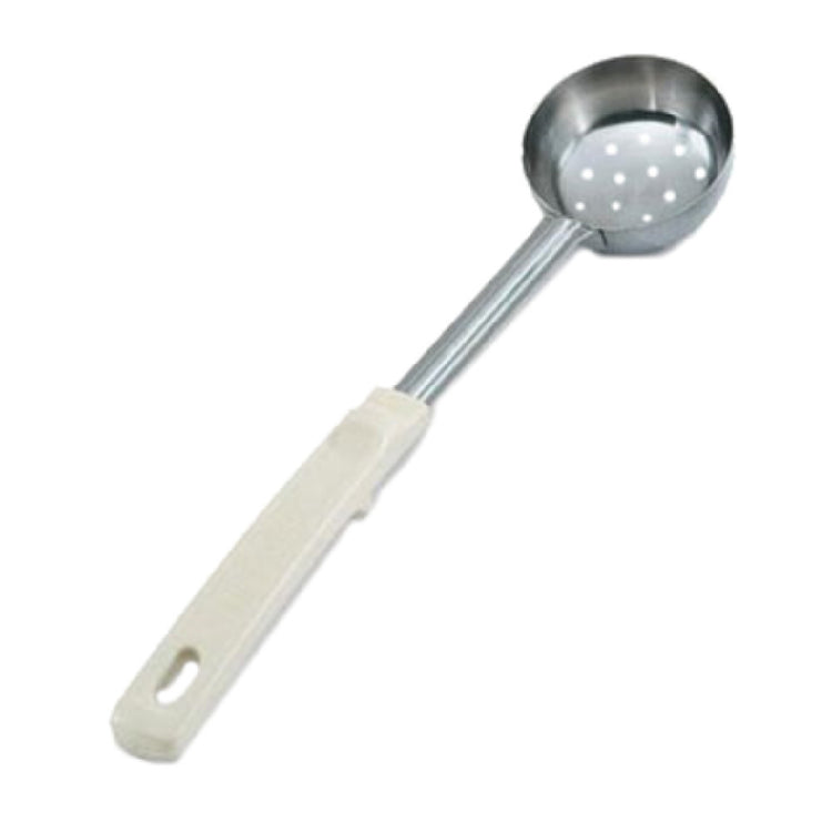 The Vollrath 62165 Spoodle® 3 Oz. Perforated is a versatile kitchen tool distinguished by its precise capacity of 3 ounces, making it suitable for portion control in various culinary applications. Constructed from stainless steel, this spoodle is both durable and resistant to corrosion, ensuring a long-lasting addition to any professional kitchen. The perforated design allows for efficient draining of liquids, enhancing its utility in both cooking and serving contexts. This tool is color coded with an ivory Grip 'N Serv® plastic handle, which not only provides a comfortable grip but also features all-natural antimicrobial properties to maintain hygiene standards. With an overall length of 13-1/16 inches, it offers extended reach, ideal for accessing food in deep pots or containers. Proudly made in the USA, the Vollrath 62165 Spoodle® serves diverse segment markets, including restaurants, catering services, and institutional dining facilities, where precision and reliability are paramount. Its combination of practical design elements and robust construction makes it a valuable tool for food service professionals seeking efficiency and quality in their kitchen equipment.