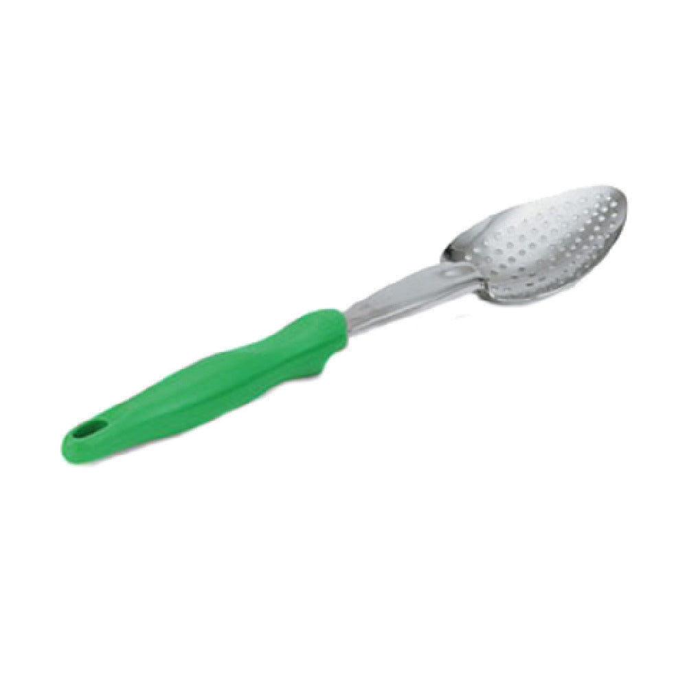 The Vollrath 6414270 Ergo Grip™ Heavy Duty Spoon is meticulously designed to meet the demanding needs of food service professionals. This robust utensil features a perforated design, crafted from heavy gauge 18/8 stainless steel, ensuring durability and reliability in any kitchen environment. Measuring 13-13/16 inches, the spoon's ergonomic handle is made from green nylon, providing a comfortable grip with a textured surface designed for ease of use and efficiency. The handle is equipped with a built-in stopper notch to prevent it from slipping into pots or pans, enhancing its practicality. Notably, the handle incorporates all-natural antimicrobial properties, adding an extra layer of hygiene, which is crucial for maintaining food safety standards. Capable of withstanding temperatures up to 450°F (232°C), this spoon is designed to handle high-temperature applications without compromising its structural integrity. Part of the esteemed Jacob's Pride® Collection, the Vollrath 6414270 spoon is NSF certified, indicating it meets stringent health and safety requirements. Additionally, it comes with a Limited Lifetime Warranty, offering peace of mind to users. Imported and crafted for professional kitchens, this utensil stands as a valuable tool for chefs and culinary experts who prioritize functionality and longevity in their equipment.