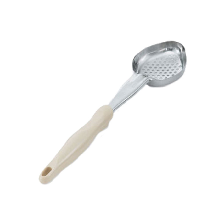 The Vollrath 6422335 Spoodle® 1-piece Heavy Duty Perforated Oval Bowl is a high-quality kitchen tool designed for professional use. Crafted from durable 18/8 304 stainless steel, this spoodle is part of the esteemed Jacob's Pride® Collection, ensuring longevity and performance. Its perforated oval bowl design is ideal for precise portion control and efficient draining, holding a capacity of 3 oz. (88.7ML). The handle is coded ivory and made from an ergonomic high-temperature textured nylon, offering heat resistance up to 450°F (232°C), which ensures a safe and comfortable grip during use. The built-in stopper notch adds convenience by preventing the spoodle from sliding into a pot or bowl. For added hygiene, the handle features all-natural antimicrobial properties. The spoodle measures 13-1/2" in overall length with a 3-3/8" bowl diameter, and the capacity is clearly stamped on the shaft for easy identification. This product is NSF certified, reflecting its adherence to rigorous health and safety standards, and it comes with a limited lifetime warranty, underscoring its reliability and durability. Imported for professional kitchens, the Vollrath 6422335 is a versatile choice for chefs seeking a dependable tool for consistent and efficient food preparation.