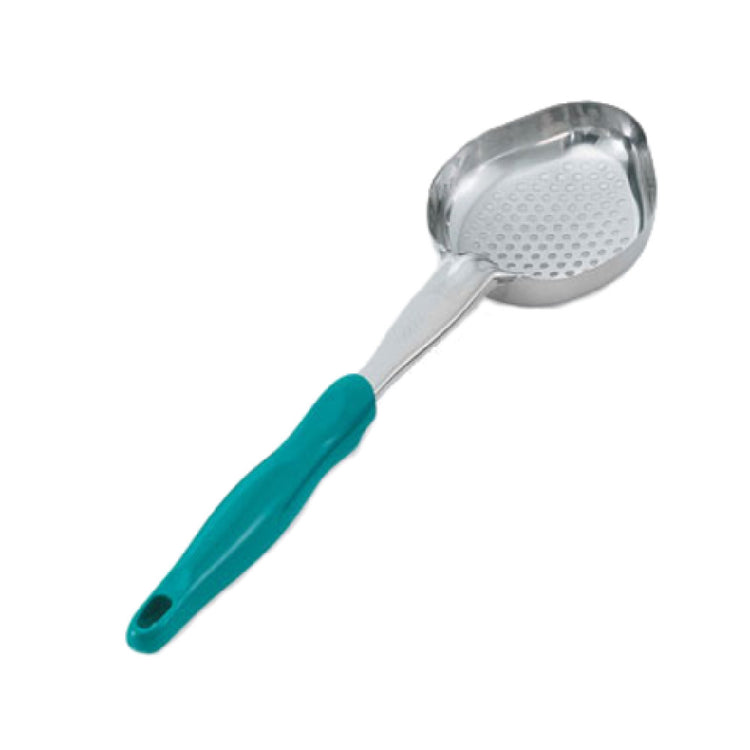 The Vollrath 6422655 Spoodle® 1-piece Heavy Duty Perforated Oval Bowl is a versatile tool designed for professional kitchens, with a capacity of 6 oz. (177.4ML) making it suitable for precise portion control. Engineered with an 18/8 304 stainless steel construction, this spoodle ensures durability and longevity. Its perforated oval bowl is ideal for draining excess liquids, enhancing its functionality in various culinary applications. The teal-coded handle is not only ergonomic, providing a comfortable grip, but also features high-temperature textured nylon that withstands up to 450°F (232°C). This handle is equipped with all-natural antimicrobial properties, supporting sanitation efforts in food preparation environments. A built-in stopper notch provides additional convenience, allowing the spoodle to rest securely on pan edges. For easy identification and inventory management, the capacity is stamped directly on the shaft. Measuring 14-3/8" in overall length with a 4-1/4" bowl diameter, this tool is a practical choice for chefs and kitchen staff. Part of the Jacob's Pride® Collection, the spoodle carries a limited lifetime warranty, underscoring its quality assurance. NSF certified and imported, the Vollrath 6422655 Spoodle® exemplifies a commitment to excellence in food service tools.