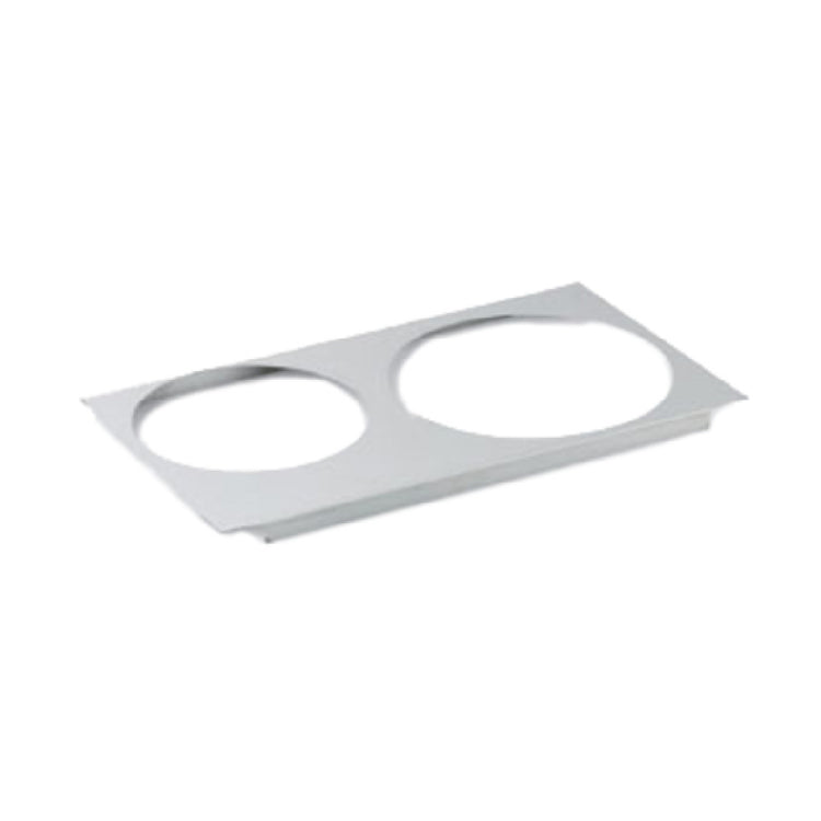 The Vollrath 72227 Adapter Plate - Stainless is a precisely engineered accessory designed to enhance the functionality of Vollrath full-size warmers, with the specific exception of models 72601 and 72602. It features unique dual inset holes, including one 8-3/8" diameter inset hole and one 10-3/8" diameter inset hole, making it versatile for a variety of applications. This adapter plate is specifically tailored to fit Vollrath models 78184 and 78204, ensuring a seamless integration with these warmers. Crafted from durable stainless steel, this adapter plate not only offers longevity and resistance to wear but also meets rigorous American manufacturing standards as it is made in the USA. The Vollrath 72227 Adapter Plate serves different market segments within the foodservice industry by providing flexible utility in both commercial kitchens and catering operations. Its ability to accommodate different inset sizes supports efficient food holding and service, making it a valuable tool for chefs and foodservice professionals seeking reliable equipment solutions. The technical specifications of the Vollrath 72227 Adapter Plate underscore its role as an essential component for enhancing the performance and versatility of compatible Vollrath full-size warmers.