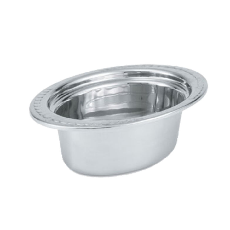 The Vollrath 8230110 Miramar™ Decorative Oval Pan is a 3.4 quart (3.2L) cookware piece engineered for both functionality and elegance, suitable for varied culinary settings. Crafted from premium 18-8 stainless steel, this pan features a robust 1.5mm thickness ensuring durability and long-lasting performance. Its 4-inch depth provides ample space for diverse cooking needs, making it ideal for preparing both hot and cold dishes. The distinctive "rings" embossing on the rim not only enhances its aesthetic appeal but also adds a touch of sophistication to any table setting. The mirror finish gives the pan a sleek and modern look while also making cleaning straightforward, as it is dishwasher safe. Certified by NSF, this pan adheres to strict public health and safety standards, emphasizing its quality and reliability. Imported with meticulous attention to detail, the Vollrath 8230110 Miramar™ Decorative Oval Pan is a versatile addition to any kitchen, catering to professional chefs and home cooks alike, who value superior design and functionality in their kitchenware.
