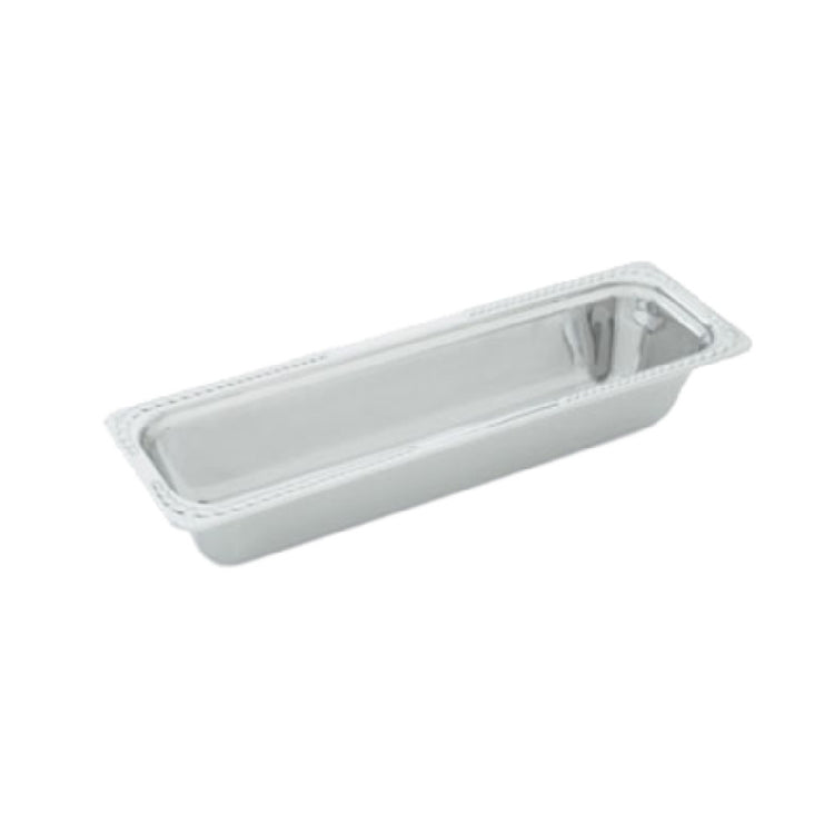 The Vollrath 8230920 Miramar™ Decorative Food Pan exemplifies a blend of aesthetic elegance and functional design, ideal for catering to diverse culinary settings. This 1/2 size long pan measures 20-15/16 inches in width, 6-1/2 inches in depth, and 4 inches in height, presenting a 4.4-quart capacity that is perfect for serving a variety of dishes. The pan is constructed from 18/8 high-polished stainless steel, ensuring durability and a sophisticated appearance that enhances any food presentation. Its embossed pattern on the rim adds a decorative touch, making it suitable for upscale dining environments. The pan is NSF certified, indicating its adherence to strict public health and safety standards, which is crucial for professional food service operations. Imported and crafted with precision, this food pan integrates seamlessly into buffet lines, catering events, or high-end restaurant displays. Its robust construction and stylish design ensure that it serves both as a functional kitchen tool and a centerpiece for culinary presentation, meeting the unique needs of various segments within the food industry looking to balance practicality with appealing aesthetics.