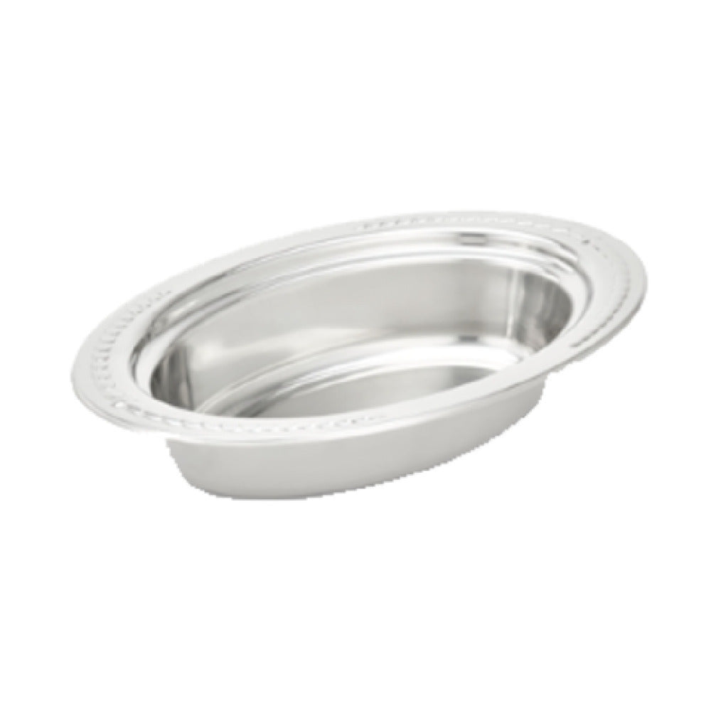 The Vollrath 8231320 Miramar™ Decorative Foodpan Oval 6.4 Quart (5.1L) is an elegantly designed serving solution that combines both style and functionality, ideal for diverse culinary environments. Crafted from durable 18-8 stainless steel with a thickness of 1.5mm, this foodpan exhibits exceptional resilience and longevity. Its 4-inch depth and generous capacity of 6.4 quarts (5.1 liters) make it suitable for both hot and cold food applications, accommodating a wide range of dishes. The pan features a distinctive "rings" embossing on the rim, enhancing its aesthetic appeal, while the mirror finish provides a sophisticated touch to any buffet or catering presentation. Measuring 19-1/16 inches by 11-7/8 inches by 4 inches, this oval foodpan offers ample space without compromising on elegance. It is dishwasher safe, ensuring ease of cleaning and maintenance, and is NSF certified, affirming its adherence to public health and safety standards. Imported with precision, the Vollrath 8231320 Miramar™ Decorative Foodpan is a versatile addition to professional settings, offering a perfect blend of practicality and refined design for chefs and caterers aiming to elevate their food presentation.