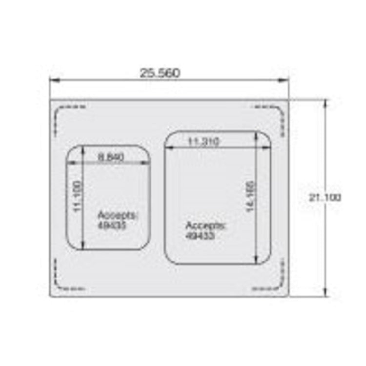 The Vollrath 8250816 Miramar™ Double Size Template for Miramar™ Cookware Stainless Steel Satin Edge is a specialized kitchen accessory designed to optimize the use of Vollrath's Miramar cookware series. Fabricated from high-quality stainless steel with a satin edge finish, this template measures 21-1/8" x 25-3/4", making it suitable for various culinary environments. It features one large and one small food pan cutout, accommodating the 49435 Small Food Pan with handle and either the 49433 Large Food Pan with handle or the 49432 pan without handles, offering flexibility in presentation and service options. Proudly made in the USA, this product is crafted to order and is non-cancellable and non-returnable, emphasizing its bespoke manufacturing process. The precision design enhances the functionality and aesthetic appeal of the Miramar cookware range, catering to the needs of professional chefs and catering services who require reliable and efficient serving solutions. The Vollrath 8250816 Miramar™ template is an essential component for culinary professionals seeking to streamline their kitchen operations while maintaining a polished and organized food presentation. Its robust construction and compatibility with specific cookware models ensure it meets the exacting standards of the foodservice industry.