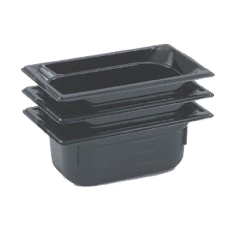 The Vollrath 9042420 Super Pan® 1/4 GN Food Pan 2-1/2" Deep High-temp Black Resin is a versatile and durable solution for food service operations requiring high-performance food storage. Crafted from high-temp black resin, this pan is designed to withstand rigorous conditions while maintaining its structural integrity. Its 2-1/2" depth offers ample space for a variety of food items, ideal for kitchens needing flexibility in storage. The innovative design includes top flange corners with a concave indentation, which prevents jamming when stacking, thus optimizing storage space and efficiency. Additionally, the ramped sides and reverse form flattened edge enhance its usability, allowing for easy handling and transport. The framing shoulder integrates seamlessly with the SPV stainless steel pan line, providing adaptability and interchangeability that meets the demands of dynamic kitchen environments. It adheres to the gastronorm (EN 631-1) standard, ensuring compatibility with other kitchen equipment globally. NSF certification underscores its compliance with public health standards, and its manufacture in the USA reflects a commitment to quality. This Super Pan® is an essential asset for professional kitchens, offering reliability and performance with a focus on practical design and quality construction.