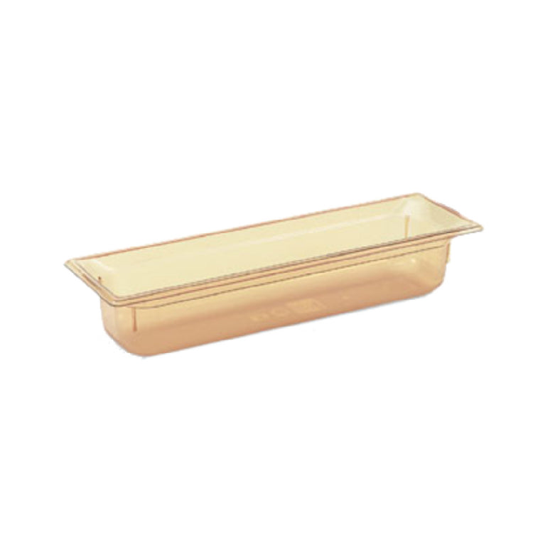 The Vollrath 9054410 Super Pan 2/4 GN Food Pan 4" Deep High-temp Amber Resin is a versatile and durable solution for professional kitchens and catering environments. Constructed from high-temperature amber resin, this pan is designed to withstand rigorous conditions while maintaining its integrity and performance. With a depth of 4 inches, it is well-suited for storing and serving a variety of dishes, making it an essential tool for efficient food preparation and presentation. The top flange corners are engineered with a concave indentation and anti-jamming feature, ensuring easy stacking and separation. The pan's ramped sides and reverse form flattened edge facilitate smooth handling and nesting. A framing shoulder adds structural support, enhancing its longevity and reliability in busy kitchen settings. This product is interchangeable with the SPV stainless steel pan line, offering adaptability to different operational needs. It meets the stringent gastronorm (EN 631-1) standards, emphasizing its suitability for international food service applications. Proudly made in the USA, the Vollrath 9054410 is NSF certified, underscoring its compliance with rigorous health and safety standards. Its innovative design and robust construction make it a valuable asset for any food service establishment aiming to maximize efficiency and productivity.