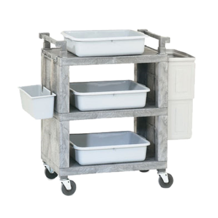The Vollrath 97111 Utility Cart Closed End 200-Pound Capacity is a robust and versatile piece of equipment, tailored for a variety of industrial and commercial environments. Constructed from heavy-duty structural foam plastic, this utility cart boasts a knock-down design that ensures durability and ease of assembly. Its foam plastic handle and gray finish provide both functionality and a sleek appearance. The enclosed end panels add an extra layer of security, making it ideal for transporting sensitive materials. The cart features three spacious shelves, each measuring 29x18-1/2 inches, with a 12-inch gap between shelves, providing ample storage space. Supported by 4-inch swivel casters, the cart offers smooth and agile maneuverability across different floor surfaces. Standing at 39 inches in height, with a length of 30-1/2 inches and a width of 18-1/2 inches, this utility cart is designed to fit comfortably in tight spaces while carrying substantial loads. Manufactured in the USA, the Vollrath 97111 Utility Cart is a reliable choice for professionals seeking a practical solution to material handling challenges, ensuring efficiency and organization in settings ranging from warehouses to healthcare facilities and beyond.