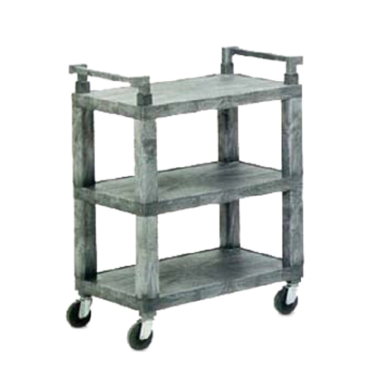 The Vollrath 97112 Utility Cart Open Ends 200 Pound Capacity is a versatile and robust solution designed for a variety of industry needs. Crafted with heavy-duty structural foam plastic, this utility cart ensures durability while maintaining a lightweight form. It features an ergonomic foam plastic handle for comfortable maneuverability, complemented by a sleek gray finish that adds a touch of professionalism to any environment. The cart is equipped with three spacious shelves, each measuring 29 inches by 18-1/2 inches, providing ample storage space with a 12-inch gap between shelves to accommodate larger items. It stands at a height of 39 inches and measures 30-1/2 inches in length and 18-1/2 inches in width, optimizing storage capacity while remaining compact. The four swivel casters, each 4 inches in diameter, facilitate smooth and easy movement, making it suitable for settings that require frequent relocation. With a weight capacity of 200 pounds, this utility cart is capable of handling substantial loads, making it ideal for sectors ranging from hospitality to healthcare. Proudly made in the USA, the Vollrath 97112 Utility Cart combines practical design with reliable performance, tailored to meet the demands of various professional environments.