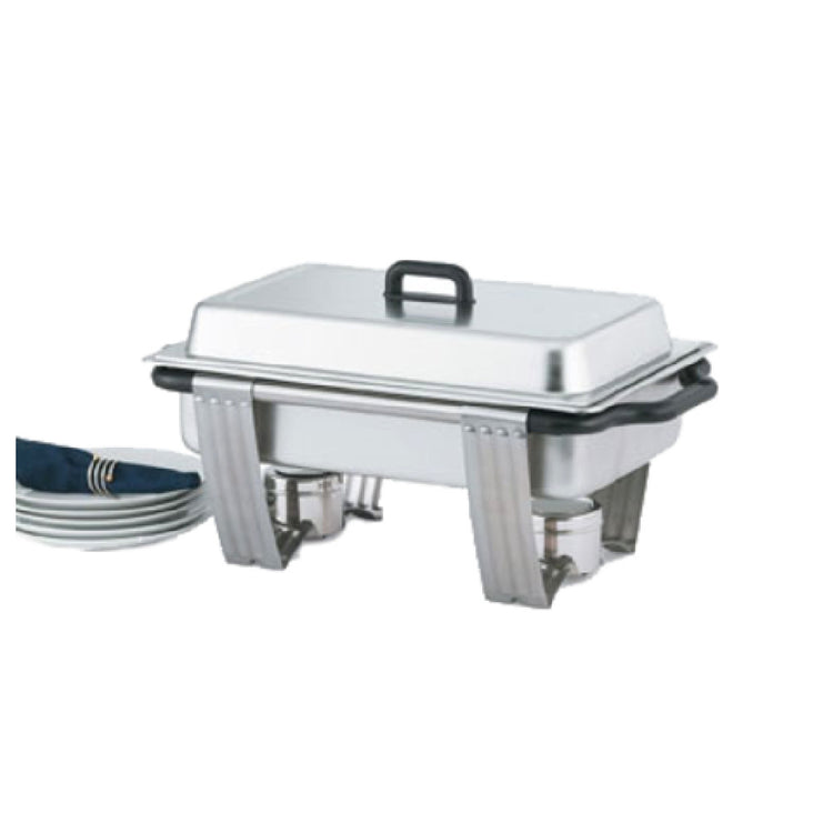 Vollrath 99860 Dakota™ Rectangular Chafer 9 Quart 1-piece is an exemplary catering and serving solution, crafted from durable 18/8 stainless steel with a matte finish that ensures both resilience and a sleek appearance. This chafer stands out with its embos legs and a tubular designed frame, providing stability and a modern aesthetic suitable for upscale dining events. The molded hi-temp nylon side handles are designed for safe and comfortable handling, while the Kool-Touch® nylon cover handles offer heat resistance, ensuring user safety. Notably, the chafer includes a stacking frame, enhancing convenient storage and space efficiency. It comes equipped with an SPV full-size 2-1/2" food pan, a water pan, a dome cover, and a frame with 2 fuel holders, offering a complete package for efficient food service. This product, made in the USA, is suited for various segments within the foodservice industry, from catering companies needing reliable and elegant presentation options to restaurants seeking durable equipment for buffet setups. The Vollrath 99860 Dakota™ Rectangular Chafer combines practicality with aesthetics, making it a versatile choice for professionals who value performance and style in their serving equipment.