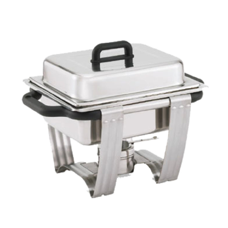 The Vollrath 99870 Dakota™ Half-Size Chafer 4.1 Quart (3.8L) 18/8 Stainless Steel With Satin-finish Embossed Legs is a meticulously crafted serving solution perfect for varied catering environments. This chafer, with a capacity of 4.1 quarts (3.8 liters), is constructed from high-quality 18/8 stainless steel, ensuring both durability and a sophisticated appearance. The satin-finish embossed legs enhance its visual appeal while providing stable support. Designed with molded hi-temp nylon side handles, it offers safe and easy handling. The Kool-Touch® nylon cover handle adds an extra layer of safety by reducing heat transfer. Its stacking frame optimizes storage efficiency, making it an excellent choice for space-conscious establishments. The chafer includes a dome cover, a 2-1/2" SPV food pan, a water pan, a frame, and a fuel holder, all contributing to its versatile functionality. Measuring 18"x12"x13", this imported chafer fits seamlessly into various service settings, from high-end hotels to bustling banquet halls. Its thoughtful design and comprehensive features cater to different segments within the food service industry, providing a reliable and elegant solution for keeping food warm and ready to serve.