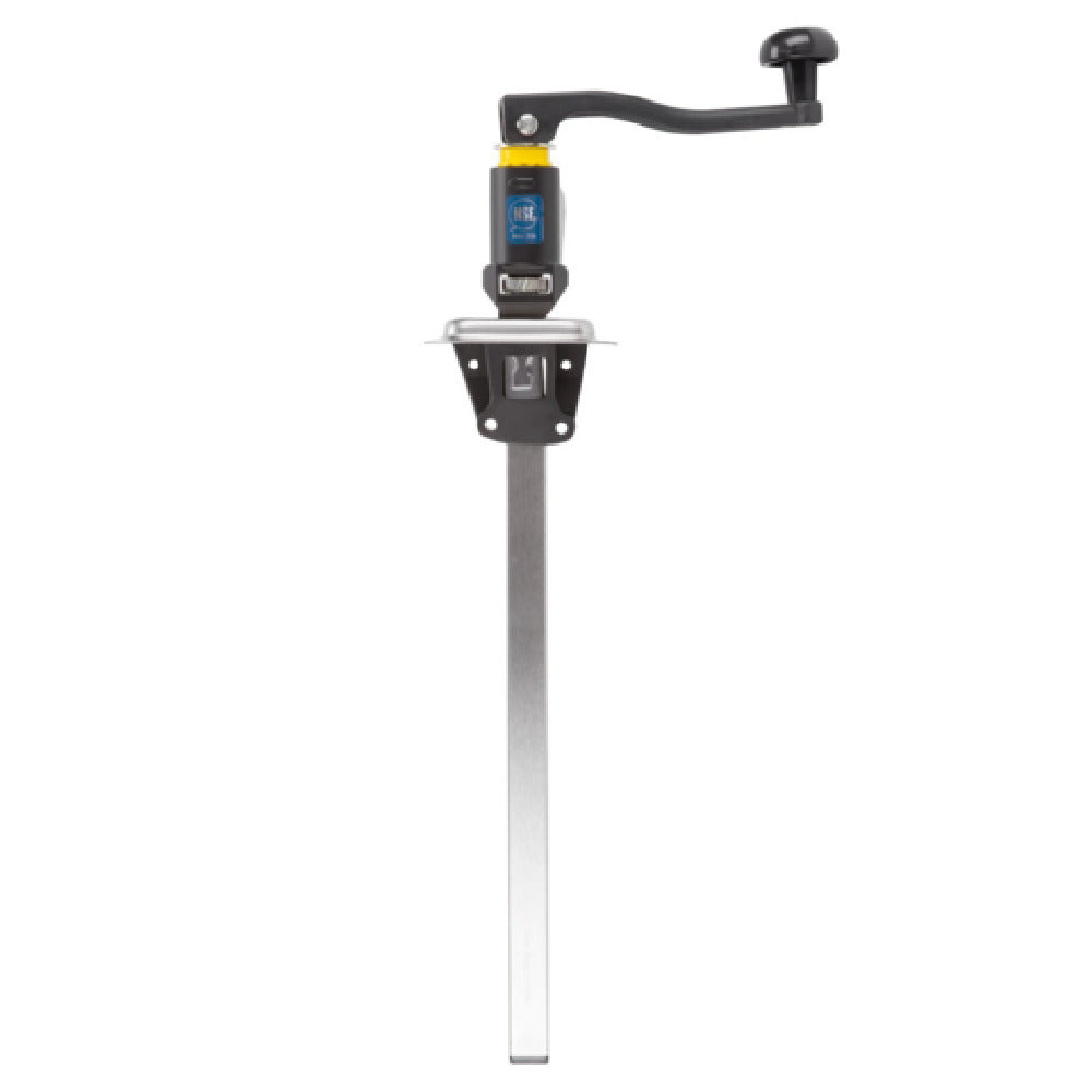 The Vollrath BCO-2000 EaziClean® Can Opener - medium-duty yellow color-coded collar is a precision-engineered kitchen tool, ideal for various food service environments. Constructed from zammac alloy, this can opener features a robust stainless base and a 16-inch bar length/shaft, providing durability and extended reach for opening cans. Its ergonomic design ensures user comfort during repetitive tasks, while the patented quick-release blade enhances efficiency and safety. The can opener is equipped with a case-hardened blade finished with an antibacterial coating, promoting hygiene in food preparation areas. A high-grade steel cutting mechanism delivers a clean cut every time, and all cutting components are dishwasher safe, simplifying maintenance. The device accommodates a maximum can height of 14 inches and is capable of processing up to 20 #10 cans per day, making it suitable for mid-volume operations. The 1-inch gear provides smooth motion, and the product carries a 2-year warranty, ensuring peace of mind for users. Blade, gear, and cartridge replacements are available under items BCO-11, BCO-12, and BCO-15, respectively. NSF certified and imported, the Vollrath BCO-2000 is a reliable choice for those seeking efficiency and sanitation in their can opening processes.
