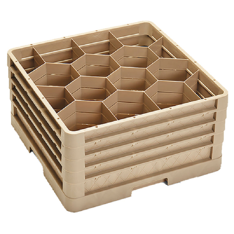 The Vollrath CR18JJJJ Traex® Rack Max® Full Size (12) Compartment Cup/Glass is specifically designed for efficient storage and handling in foodservice and hospitality environments. This product features a closed wall base combined with four extenders, offering superior protection and stability for glassware and cups. With each compartment measuring 4-3/4" in diameter and possessing a hexagonal shape, it effectively accommodates a variety of cup and glass sizes. The inside height of 9-7/16" ensures versatility in holding taller items securely. Crafted from durable co-polymer plastic, this rack is available in a neutral beige color, making it an unobtrusive addition to any kitchen or serving area. The Vollrath CR18JJJJ is NSF certified, attesting to its adherence to rigorous public health and safety standards. Proudly made in the USA, this rack is made to order, guaranteeing quality craftsmanship tailored to meet specific operational needs. The Vollrath CR18JJJJ Traex® Rack Max® is ideal for businesses seeking a reliable, robust solution to streamline cup and glass handling processes, enhancing both efficiency and organization.