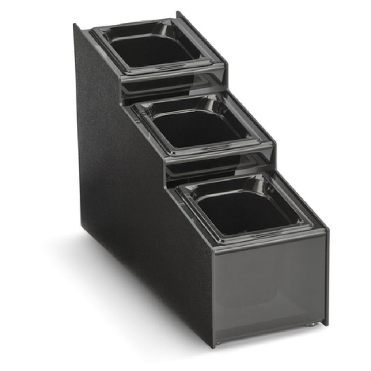 The Vollrath CTCPAN3-6 Countertop Condiment Organizer is a meticulously designed unit, measuring 7-11/16 inches in width, 21 inches in depth, and 14-5/8 inches in height. Its compact size makes it an optimal choice for a variety of settings, from busy commercial kitchens to self-serve condiment stations in cafés and restaurants. This organizer accommodates three 1/6 size plastic pans, with three black pans included, offering versatility in organizing condiments, toppings, or garnishes. Constructed from durable black ABS and featuring smoked acrylic accents, it combines both functionality and style, seamlessly integrating with modern kitchen aesthetics. The NSF certification highlights its adherence to high standards of safety and sanitation, crucial for food service applications. Proudly made in the USA, the Vollrath CTCPAN3-6 Countertop Condiment Organizer is suitable for different market segments, including fast-food chains, cafeterias, and catering services, where efficient condiment management is essential. Its robust construction and thoughtful design ensure that it not only meets but exceeds the demands of high-volume food service environments, providing a reliable and organized solution for any establishment looking to streamline their condiment service area.