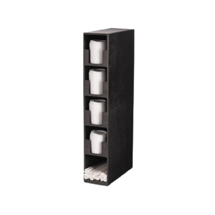 Vollrath CTL-4VS Vertical Counter Top Lid & Straw Holder. Maximize Limited Counter Space With Sleek & Narrow Cabinet. Made Of Durable Black ABS Plastic. Rubber Feet Keep Unit In Place. Straw Pocket Can Handle A Full Box Of Straws Up To 12" L.