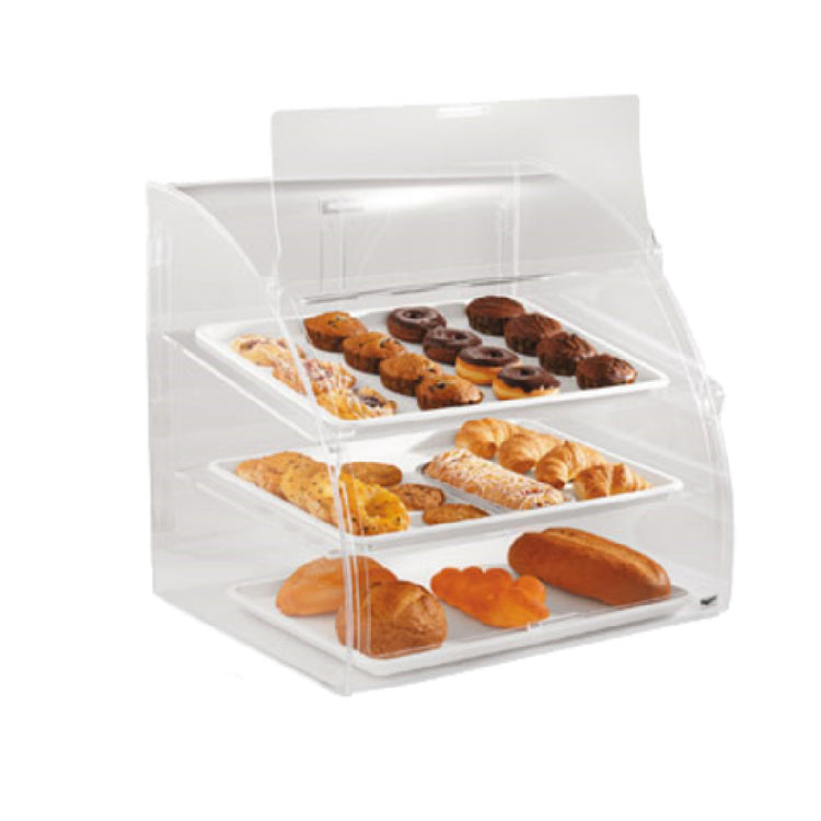The Vollrath ELBC-2 Euro Curve Bakery Case Countertop Self/Full Service unit is a versatile and practical solution for showcasing baked goods. With dimensions of 29-3/4" width, 24-1/8" depth, and 27-3/4" height, this bakery case is compact yet spacious enough to accommodate three 18" x 26" trays, making it ideal for both small and medium-sized bakery operations. The design features both front and rear doors, allowing for self-service or full-service configurations, enhancing accessibility and customer interaction. Constructed from clear acrylic, the case offers excellent visibility, ensuring the aesthetic appeal of displayed products is highlighted while maintaining durability and ease of cleaning. Included are three white trays, each measuring 18" x 26", which provide a clean and neutral backdrop to emphasize the vibrancy of your baked goods. The Vollrath ELBC-2 is designed to seamlessly fit atop countertops, making it a convenient choice for bakeries, cafes, and retail environments where space optimization is essential. This unit embodies efficiency in design, catering to diverse market segments by combining clear presentation, user-friendly access, and practical dimensions, all while maintaining the quality standards expected in the food service industry.