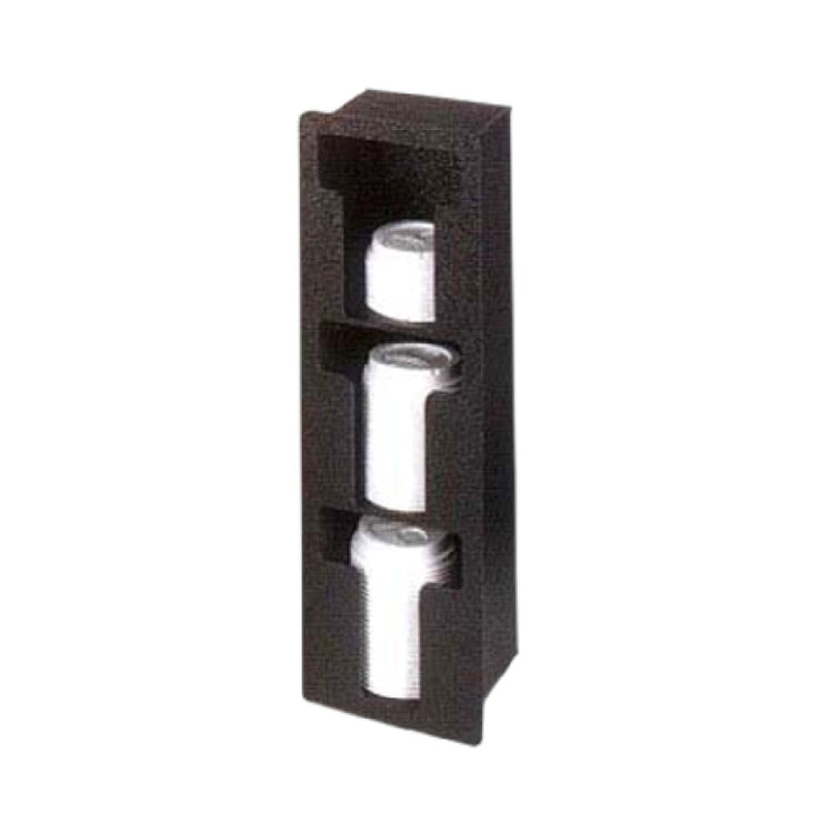 The Vollrath FML-3V Flush Mount Lid Holder is a practical solution featuring three columns arranged in a vertical mount, designed to efficiently organize lids in professional environments. Measuring 6-1/2 inches in width, 5-3/8 inches in depth, and 19-3/8 inches in height overall, this lid holder offers a compact yet effective storage option. The cutout size is specifically 18-7/16 inches by 5-9/16 inches, providing precise installation requirements. Constructed from black impact-resistant molded thermoplastic, it ensures durability and longevity, suitable for high-demand settings. The inclusion of mounting screws simplifies installation, making it a seamless addition to any workspace. This product is particularly valuable for industries requiring organized and accessible lid storage solutions, such as in food service operations where efficiency and space management are crucial. Its robust construction and practical design make it an ideal choice for maintaining order, enhancing accessibility, and optimizing space in busy environments. The Vollrath FML-3V Flush Mount Lid Holder stands out as a reliable and efficient tool designed to meet the specific needs of professionals seeking durable lid storage solutions.