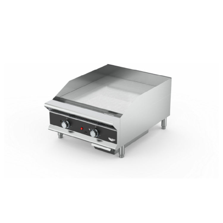 The Vollrath GGHDT-48 Heavy-Duty Flat Top Gas Griddle is a high-performance cooking appliance engineered for demanding commercial kitchens. Featuring a substantial 48-inch cooking surface powered by 120,000 BTU, this griddle excels in delivering consistent heat distribution, thanks to its four stainless steel burners strategically positioned every 12 inches, each providing 30,000 BTU. The 1-inch thick polished surface plate ensures durability and effective heat retention, essential for busy food service environments. Designed with a robust stainless exterior, the griddle is equipped with a 4-3/8-inch backsplash and sloped side splash, enhancing cleanliness and safety. Initially configured for natural gas, it includes a kit for easy conversion to propane, accompanied by a regulator and gas valve. The inclusion of metal knobs with heavy-duty guards augments its resilience, while the 4"-5-1/2" adjustable legs offer stability and adaptability to various kitchen layouts. The Vollrath GGHDT-48 also features a drip tray for efficient grease management. Compliant with ETL and cETLus standards, this griddle represents a blend of power, precision, and practicality, catering to the diverse needs of foodservice professionals across multiple segments of the culinary industry.