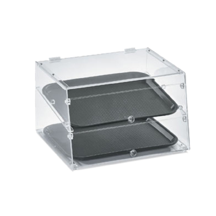 The Vollrath KDC1418-2-06 Display Case Counter Top Slant Front is a versatile display solution tailored for both self-service and full-service environments. This non-refrigerated unit measures 18-1/2" in width, 16-3/4" in depth, and 12" in height, making it compact yet spacious enough to accommodate two 14" x 18" trays, which are included with the purchase. Its design features a slant front, enhancing product visibility and accessibility for customers. The display case is constructed from clear acrylic, ensuring a robust and lightweight structure that provides a crystal-clear view of the contents from all angles. It comes equipped with two front lift-up doors and one rear lift-up door, offering flexible access for both staff and customers. This makes it particularly beneficial for bakeries, cafes, and deli counters where product presentation and customer interaction are key. Additionally, the unit is designed with rubber feet, providing stability on various countertop surfaces. The knockdown (KD) design of the case facilitates easy assembly and disassembly, making it convenient for cleaning and transportation. The Vollrath KDC1418-2-06 Display Case is an excellent choice for businesses seeking a practical and aesthetically pleasing display solution that maximizes space utilization and product accessibility.
